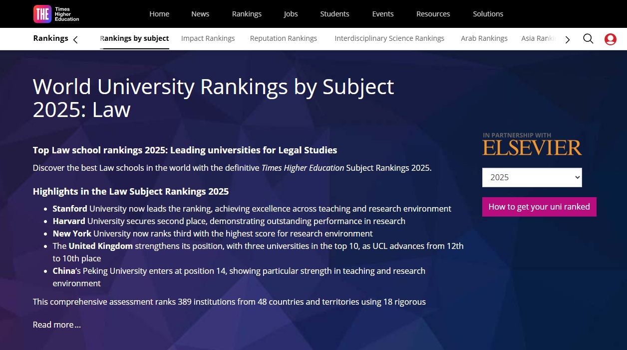 2025年泰晤士高等教育世界大学学科排名揭晓 威廉希尔williamhill官方网站法学学科位列世界第14名、中国第1名