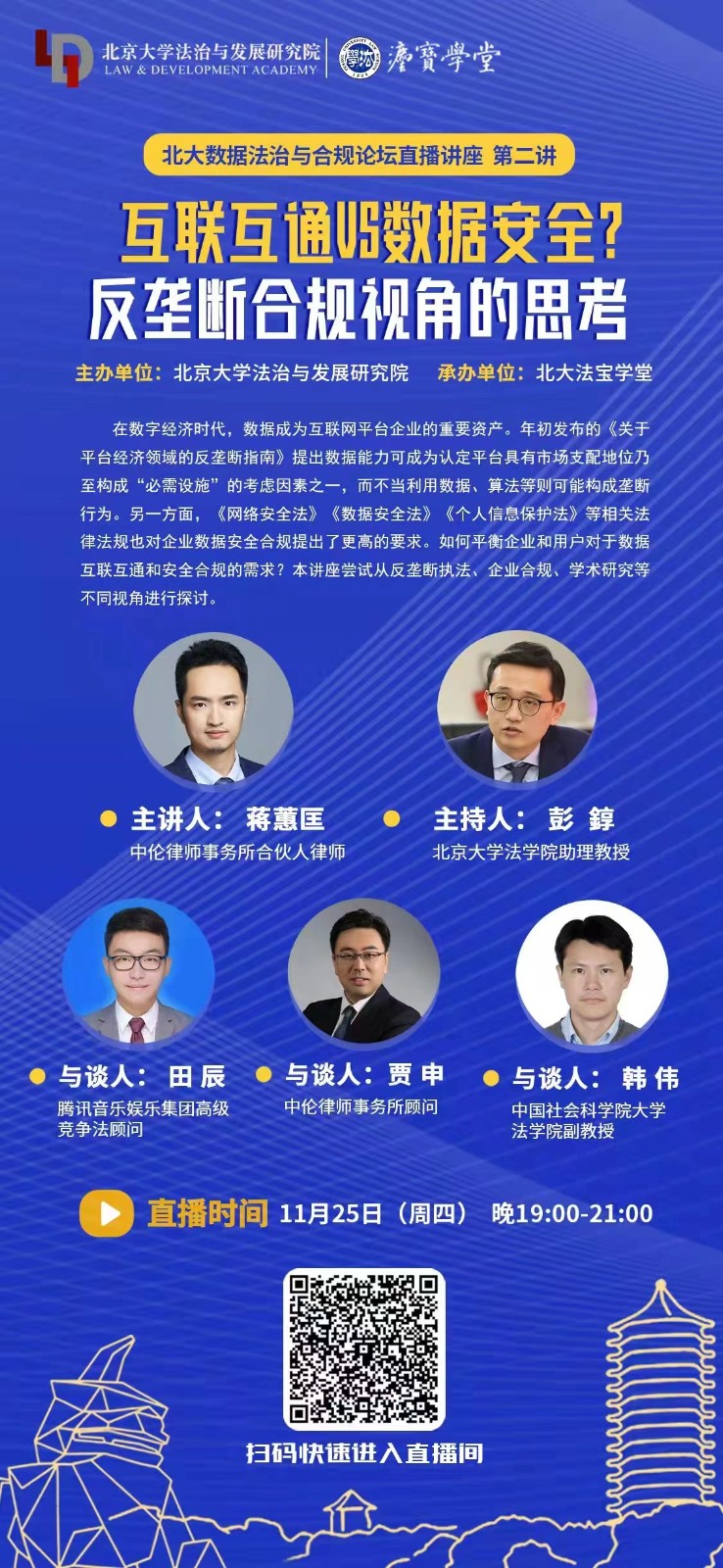在数字经济时代,数据成为互联网平台企业的重要资产。年初发布的《关于平台经济领域的反垄断指南》提出数据能力可成为认定平台具有市场支配地位乃至构成“必需设施”的考虑因素之一,而不当利用数据、算法等则可能构成垄断行为。另一方面,《网络安全法》《数据安全法》《个人信息保护法》等相关法律法规也对企业数据安全合规提出了更高的要求。如何平衡企业和用户对于数据互联互通和安全合规的需求?本讲座尝试从反垄断执法、企业合规、学术研究等不同视角进行探讨。