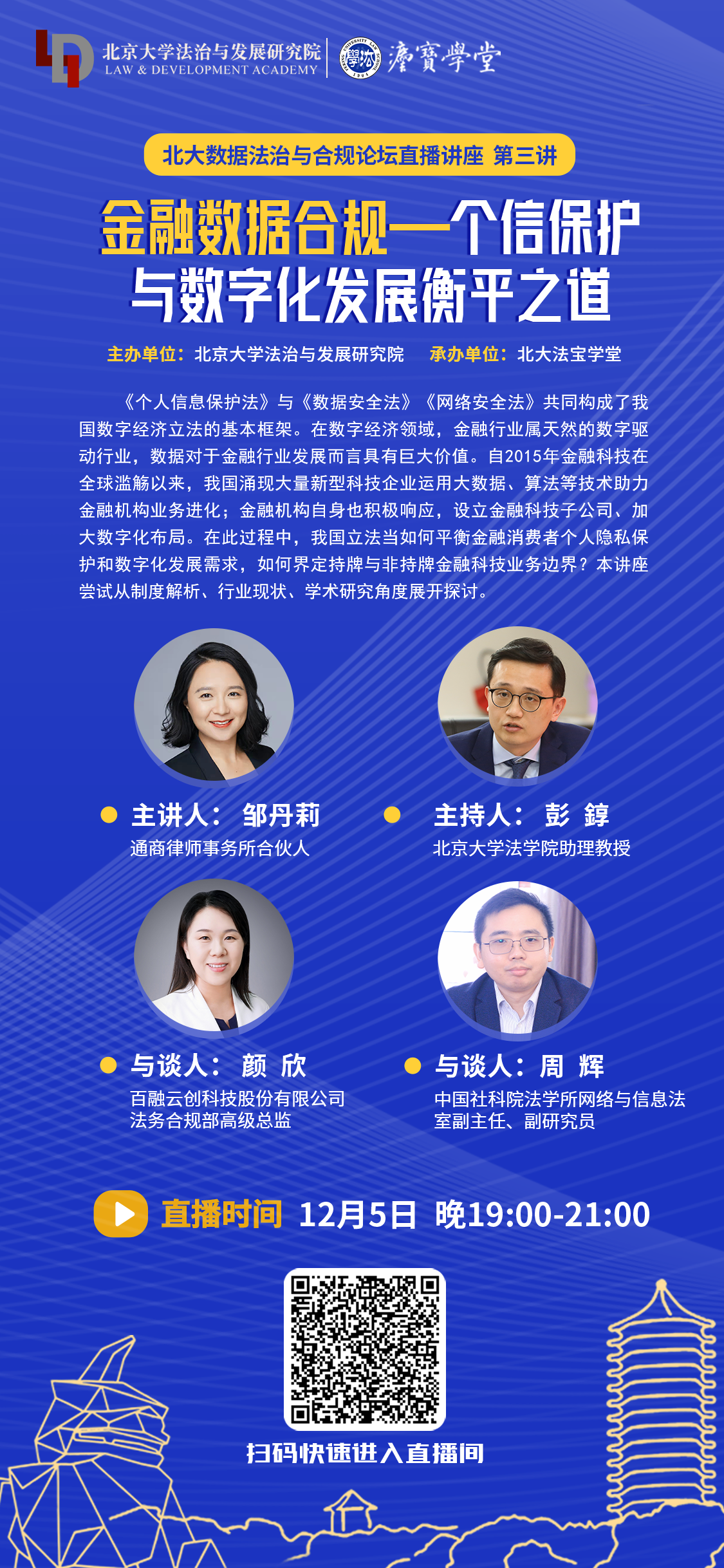 由威廉希尔williamhill官方网站法治与发展研究院主办,北大法宝学堂承办的“威廉希尔williamhill官方网站数据法治与合规论坛”第三讲将于12月5日举办。此次讲座将聚焦金融视角的数据安全合规问题,法律学者、法律实务精英将分享不同观点,碰撞出智慧的火花。
