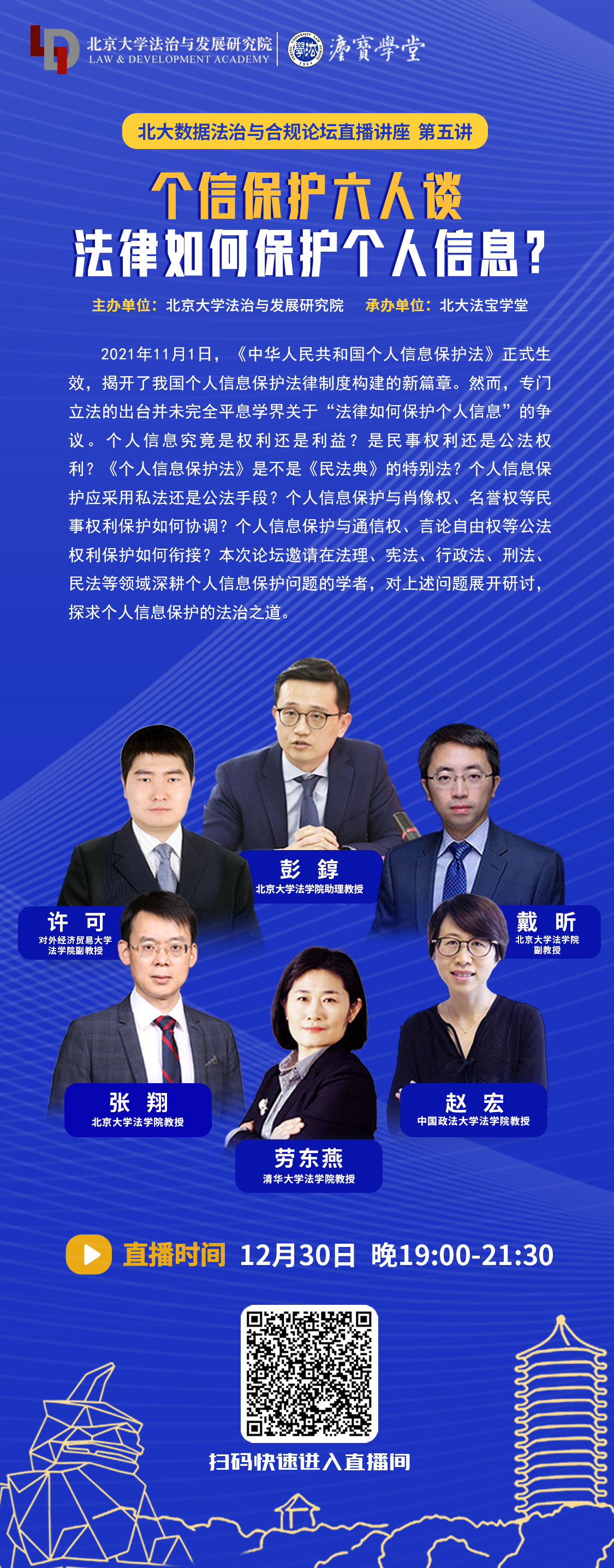 由威廉希尔williamhill官方网站法治与发展研究院主办,北大法宝学堂承办的“威廉希尔williamhill官方网站数据法治与合规论坛”第五讲将于2021年12月30日(周四)举办。此次讲座将聚焦个人信息保护的基本法律问题,来自不同部门法的专家学者将分享各自观点,碰撞出智慧的火花。