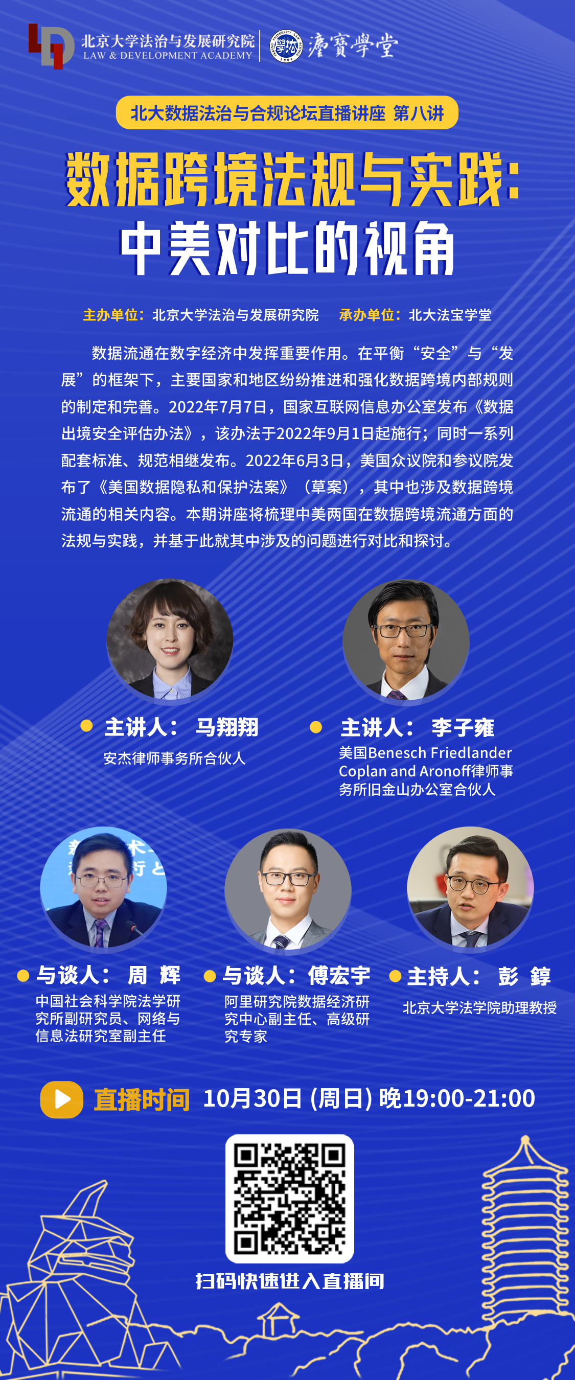 数据流通在数字经济中发挥重要作用。在平衝“安全”与“发展”的框架下,主要国家和地区纷纷推进和强化数据跨境内部规则的制定和完善。2022年7月7日,国家互联网信息办公室发布《数据出境安全评估办法》,该办法于2022年9月1日起施行;同时一系列配套标淮、规范相继发布。2022年6月3日,美国众议院和参议院发布了《美国数据隐私和保护法案》(草案),其中也涉及数据跨境流通的相关内容。本期讲座将梳理中美两国在数据跨境流通方面的法规与实践,并基于此就其中涉及的问题进行对比和探讨。