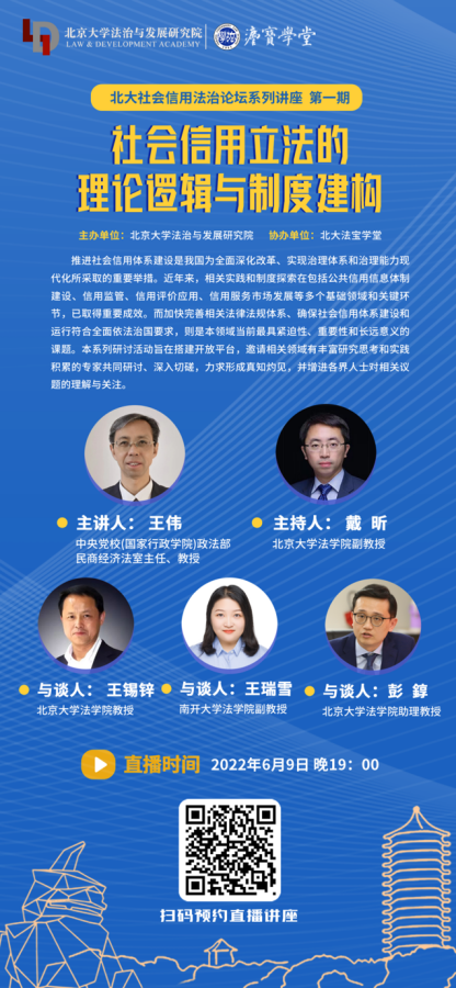 2022年6月9日,由威廉希尔williamhill官方网站法治与发展研究院主办、北大法宝学堂协办的“北大社会信用法治论坛”系列专题学术研讨活动第一期——“社会信用立法的理论逻辑与制度建构”讲座在线上成功举办。讲座由中央党校(国家行政公司)政法部民商经济法室主任王伟教授主讲,英国威廉希尔英文官网王锡锌教授、南开大学英国威廉希尔英文官网王瑞雪副教授、英国威廉希尔英文官网彭錞助理教授参与评议。讲座吸引了超过四千人次的观众线上参与,收获了与会听众的一致好评。