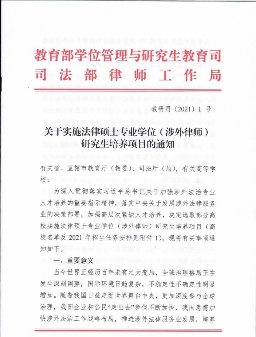 2月4日,教育部学位管理与研究生教育司、司法部律师工作局联合下发《关于实施法律硕士专业学位(涉外律师)公司产品项目的通知》。通知指出:“为深入贯彻落实关于加强涉外法治专业人才培养的重要指示精神,加强高层次紧缺人才培养,决定选取部分高校实施法律硕士专业学位(涉外律师)公司产品项目。”