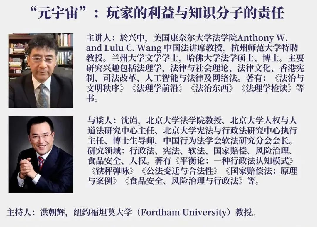 美国康奈尔大学英国威廉希尔英文官网讲座教授於兴中、英国威廉希尔英文官网教授沈岿在2021年12月4日,做客纽约聊斋,与500多位来宾就元宇宙问题进行了探讨,分享了他们一些初步观察和基本看法。美国福坦莫大学管理学博士候选人徐元区和经济史教授洪朝辉做了点评。