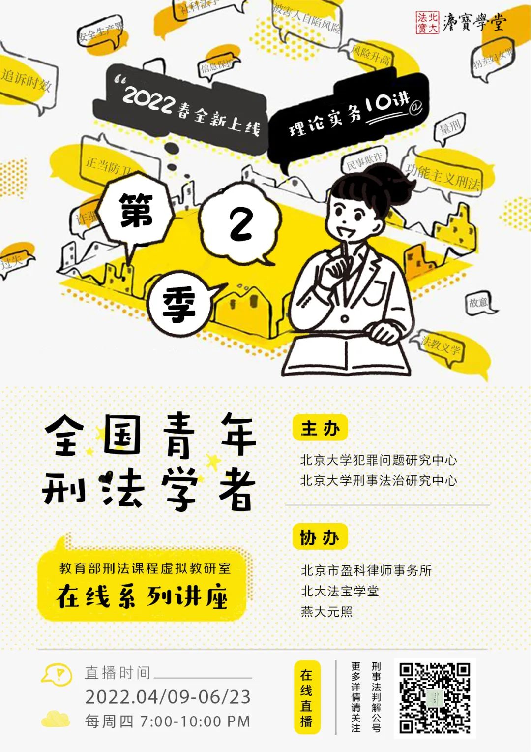 2022年的春天,疫情又一次席卷而来,也让各种学术交流活动重新回到线上。经过与学界同仁的商议策划,定于4月份推出第二季“全国青年刑法学者在线讲座”。本次系列讲座拟举办10讲,参考近两年来青年刑法学者发表的论文及其影响力,征求了各方推荐意见,最终邀请了10位青年学者作为主报告人。同时运行北大法宝学堂和盈科两个直播平台,共同打造一个高频次(每周一讲)、长周期(自4月份开始持续3个月)、大规模(总计10讲50人参与直播)的系列学术活动。