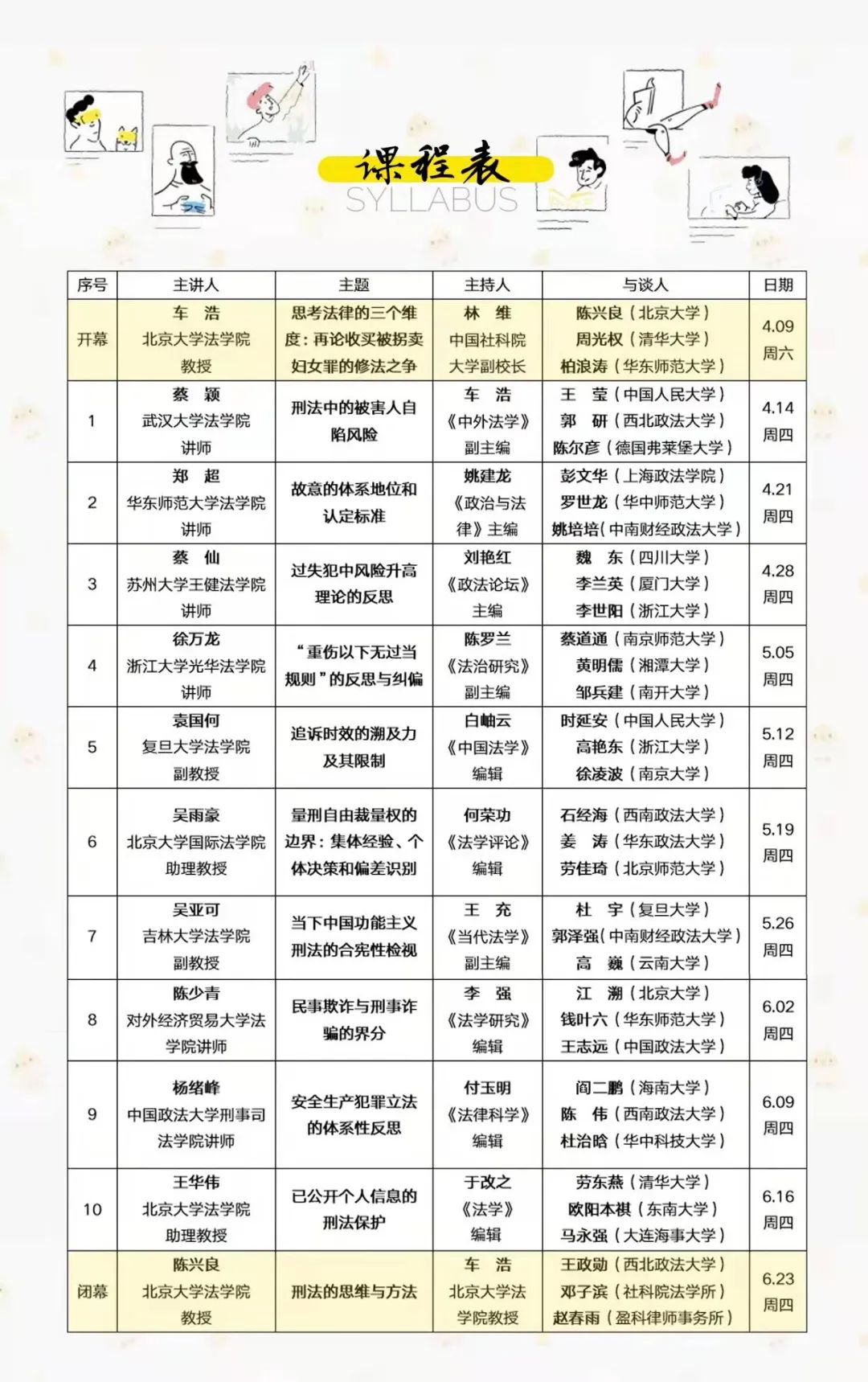 参与本次直播活动的,除了10位主讲的青年学者,以及他们推荐的对其报告主题素有研究的青年同道之外,还特别邀请了近三十位资深教授和期刊编辑作为评论人和主持人,为青年学者站台助威。特别需要指出的,活动得到了来自于北京市盈科律师事务所,特别是盈科全国刑委会主任赵春雨律师的鼎力支持。还有王登峰先生负责的北大法宝学堂的平台团队,一直以来都为我们的学术活动提供了高质量的直播平台,在此一并致谢。