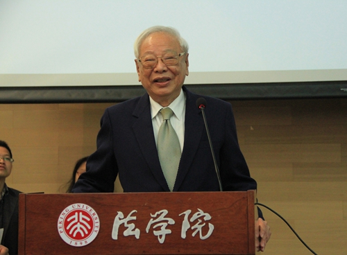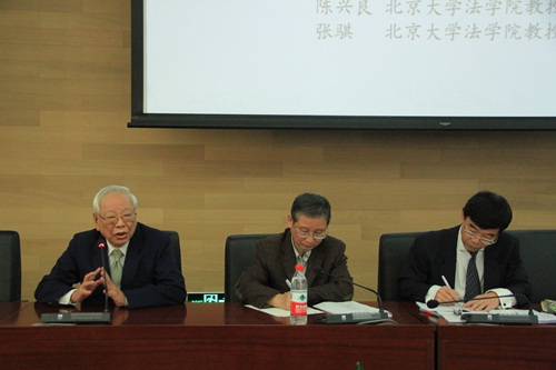 之后,翁岳生先生就“台湾地区大法官解释及制度对司法体制的影响”这一主题发表演说,陈兴良教授作主持人。翁先生首先介绍了台湾地区大法官解释制度的沿革以及变迁,指出大法官的功能从政府机关顾问转移至保障人权。翁先生认为,在台湾,大法官是人权保障的最后一道防线。此外,由于司法依靠人民的信赖而存在,因此大法官宣布法律违宪无效是相当审慎的。随后,张骐、陈兴良两位教授总结了翁先生的讲话。张教授认为翁先生从历史、功能、特点、方法四个方面介绍了大法官制度。提炼出大法官功能的“一个核心三个方面”——以解释宪法来保障宪法实施为核心,确定国家机关的权力、保障人权、通过解释代替立法是其功能的三个方面。陈教授从大陆地区实施宪法以间接实施为主,排斥直接实施的现实出发,提出台湾地区的大法官制度对将来大陆宪法从借鉴实施过渡到直接实施具有重要参考价值。