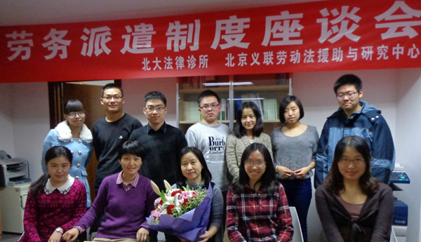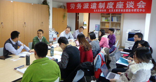 通过法律检索和研究、访谈工伤职工、工厂探访、开展问卷调查和统计分析等工作,劳动立法诊所的学员们完成了《劳务派遣制度调研报告》。其中76份的调查问卷主要来源于学员对北京三所高校的保安、食堂工作人员的访谈,对北京义联劳动法援助与研究中心援助过的劳务派遣工的回访等。《调研报告》显示,虽然《劳动合同法》就劳务派遣制度进行了专门的修改,但实践中用工单位违反“辅助性、临时性、替代性”原则使用劳务派遣工以及不同工同酬的情况仍然较为普遍。围绕《劳务派遣制度调研报告》和《对<劳务派遣若干规定(征求意见稿)>的修改建议》,劳动立法诊所召开了两次座谈会进行论证,从司法部门、行政部门、劳务派遣机构、用工单位和劳工法律援助机构等不同角度进行探讨。北京市第一中级人民法院民六庭副庭长高海鹏法官、北京市朝阳区人民法院史震法官、张丽芬法官、北京市海淀区人力资源和社会保障局劳动关系科张会彬科长、北京外企管理咨询有限公司总经理、FESCO资深律师李熠、中国国际人才开发中心第六人力资源部总经理赵玉胜、首都机场集团公司法律事务部主管朱峰、北大公司党委副书记杨晓雷、北京义联劳动法援助与研究中心研究员叶明欣等参加了座谈会。