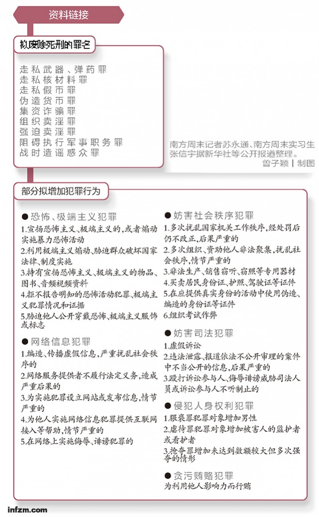南方周末记者注意到,在新增的犯罪类型中,有十余个属于妨害社会管理秩序罪范畴。扰乱公共秩序罪(主要扩展到信息网络领域)和妨害司法罪的范围都扩大了。