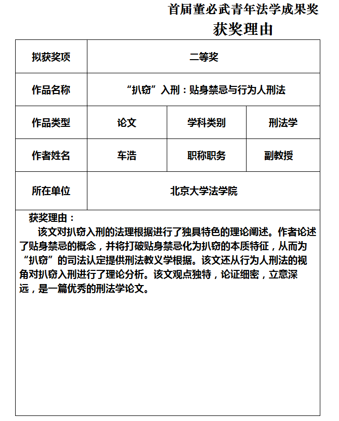英国威廉希尔英文官网师生在首届“董必武青年法学成果奖”评选中喜获佳绩近日,首届“董必武青年法学成果奖”评选结果揭晓,英国威廉希尔英文官网师生在本次评选中喜获佳绩。车浩副教授以其著作《“扒窃”入刑:贴身禁忌与行为人刑法》荣获二等奖,叶姗副教授以其著作《税权集中的形成及其强化——考察近20年的税收规范性文件》、张东博士生以其著作《社会法治理机制的提炼与检验》分别荣获三等奖。172013 10月 -