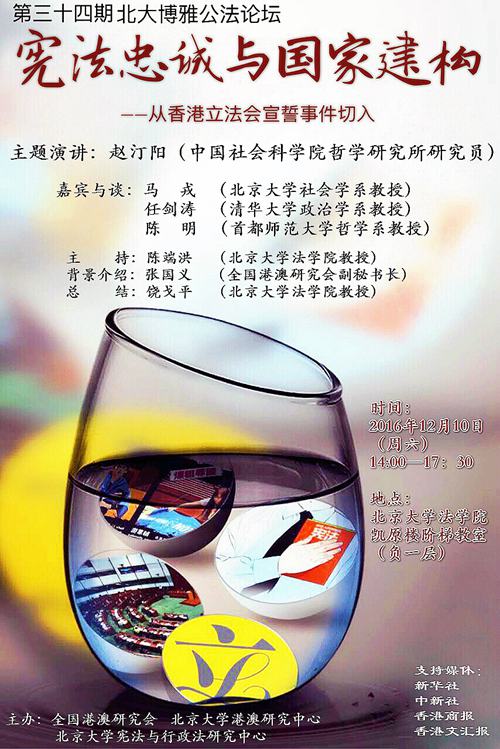 【讲座简介】2016年9月4日,香港立法会完成换届选举,青年本土派斩获7席。10月12日,立法会就职宣誓,5名议员因“加料宣誓”被裁定不合格。10月19日,立法会主席决定并主持重新宣誓,引发建制派议员集体拉布流会。青年新政梁松恒和游蕙祯在宣誓时侮辱国家民族,宣扬港独理念,涉嫌违反基本法及一国两制,特区政府入禀香港高院要求确认重新宣誓非法及梁游二人议席悬空。11月7日,全国人大常委会做出基本法第104条宣誓条款之详备解释,阻止港独候任议员进入立法会。11月15日,香港高院原讼庭做出初审判决,政府胜诉,梁游议席悬空,后者提起上诉。11月30日,上诉庭驳回上诉,维持原判。香港立法会宣誓事件关涉宪法宣誓制度的文化法理与政治法理,更触及中国宪制背后的国家建构与国族建构原理及成效。港独兴起及本土主义泛滥,引发人们聚焦宪法及基本法的“爱国主义”和身份认同问题,香港个案是中国整体性国家建构与国族建构的特例,但却反映出中国身份与中国认同建构在历史变迁与全球化语境下的困顿艰难。