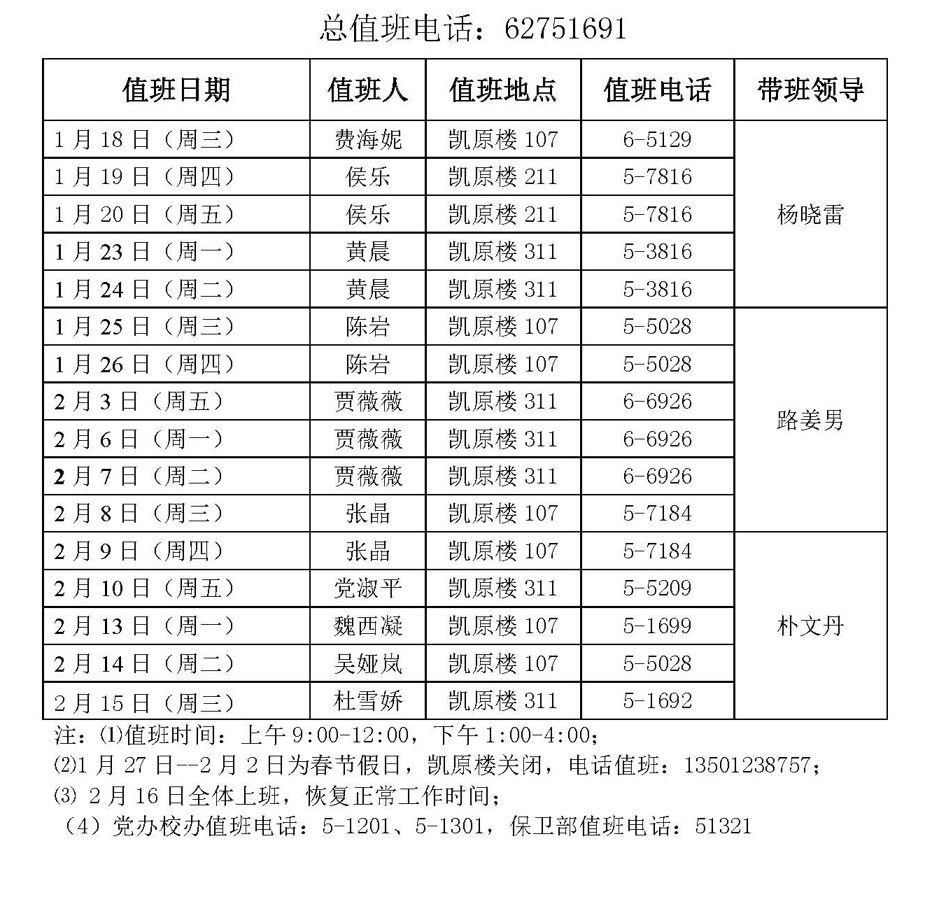 【通知】英国威廉希尔英文官网寒假值班表 2017年1月18日--2月15日