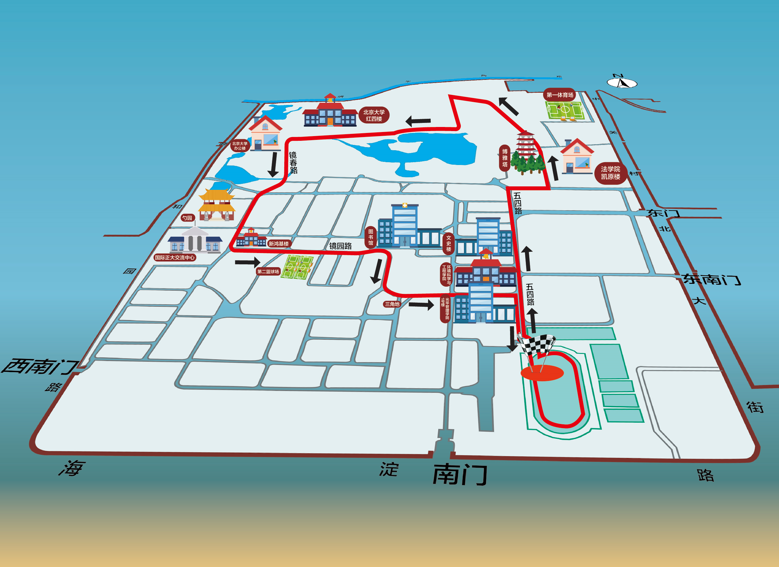 (起点)田径场北大门向北——未名湖东岸——未名湖北岸向西——办公楼向南——勺园——网球场北侧——二体北侧——二体篮球场东侧——大讲堂西侧——三角地——农园北侧右转向南——田径场北大门(终点)(单圈3公里)。