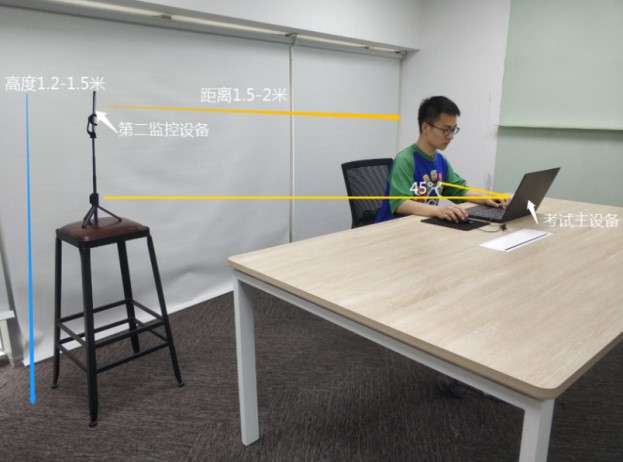 (1)考生须提前准备好相对封闭、安静、光线明亮的考试场所,以及带有摄像头功能的相关设备2台(能够下载并运行指定视频会议平台的智能手机、电脑),笔试全程禁止使用耳机设备。笔试采用“双机位”进行,即:正前方第一机位用于考生在线答题,且该机位的摄像头应确保可拍到考生头部及上半身;侧后方第二机位仅用于监控考试环境,且该机位的摄像头应确保能够从侧后方拍摄到考生本人、考试环境和考试屏幕(如下图所示)。请务必保证第二机位设备不会对笔试造成干扰。