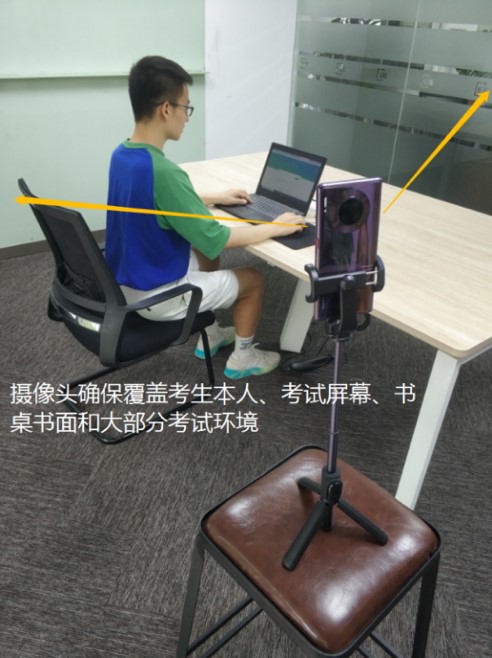(1)考生须提前准备好相对封闭、安静、光线明亮的考试场所,以及带有摄像头功能的相关设备2台(能够下载并运行指定视频会议平台的智能手机、电脑),笔试全程禁止使用耳机设备。笔试采用“双机位”进行,即:正前方第一机位用于考生在线答题,且该机位的摄像头应确保可拍到考生头部及上半身;侧后方第二机位仅用于监控考试环境,且该机位的摄像头应确保能够从侧后方拍摄到考生本人、考试环境和考试屏幕(如下图所示)。请务必保证第二机位设备不会对笔试造成干扰。