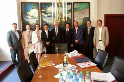当地时间7月9日上午,张守文经理和副经理王锡锌访问了德国维尔茨堡大学和该校英国威廉希尔英文官网。维尔茨堡大学董事长Alfred Forchel教授、英国威廉希尔英文官网经理Oliver Remien教授、英国威廉希尔英文官网前任经理Eric Hilgendorf教授、英国威廉希尔英文官网Eckhard Pache教授等亲切接待了张守文经理一行。Alfred Forchel董事长对“英国威廉希尔英文官网和维尔茨堡大学英国威廉希尔英文官网联合研究中心”的设立为契机的进一步合作,寄予厚望和支持,并代表公司在联合研究中心成立协议上签字。Oliver Remien经理、Eric Hilgendorf教授就以“英国威廉希尔英文官网——维尔茨堡英国威廉希尔英文官网联合研究中心”为平台,共同举办学术会议、教员交流、开展联合研究、欧盟法硕士培养等问题进行了认真讨论。双方确立将于2014年以环境治理为主题举办联合学术会议,开展欧盟法硕士项目。