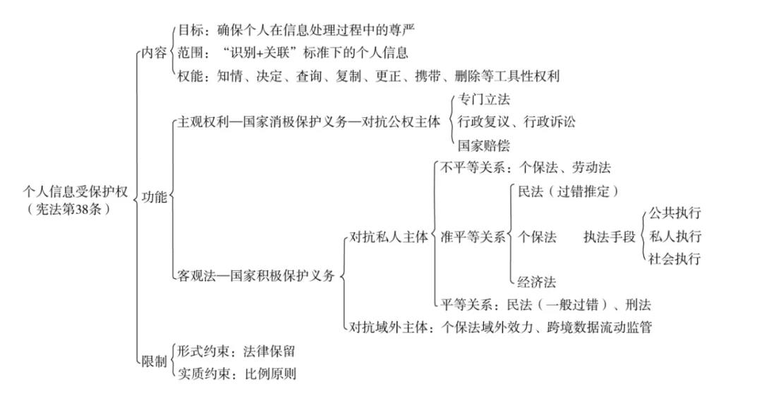 自2000年全国人大常委会《关于维护互联网安全的决定》以降,我国的个人信息保护法律制度已发展二十余载,形成了一套横跨民法、行政法、刑法、经济法、劳动法等部门法的规范体系。其中,《民法典》首次从民事基本法的高度确认个人信息受法律保护,历史意义非凡。民法学者多年的深入讨论和扎实积累,也为推动我国个人信息保护法制发展做出了不可磨灭的贡献。然而,以民事权利为个人信息保护法律体系概念基础的主流观点,在理论和实践上都值得反思,民事权利难以独担统率我国个人信息保护法律体系之重任。因此,有必要将视野提升至宪法层面,以域外经验为镜鉴,重新解释我国《宪法》第38条,发现作为基本权利的个人信息受保护权。较之民事权利基础论,以宪法上的个人信息受保护权为概念基础,对建构我国个人信息保护法律体系具有三方面的优化意义。第一,厚基础,即作为基本权利的个人信息受保护权可以为民法、行政法、刑法等具体领域的个人信息权益提供宪法依托;第二,全覆盖,即个人信息受保护权的主观权利和客观法面向要求国家承担消极与积极保护义务,由此能充分覆盖各类个人信息侵害风险源;第三,规范化,即基本权利间接第三人效力、不足禁止、功能适当、法律保留、比例原则等宪法教义,能为进一步完善个人信息保护法律制度和实践提供规范指引。总之,以宪法上个人信息受保护权为基础,能建构出一套基础更稳固、内容更完整、结构更合理的个人信息保护法律体系。该体系可由下图来直观展示: