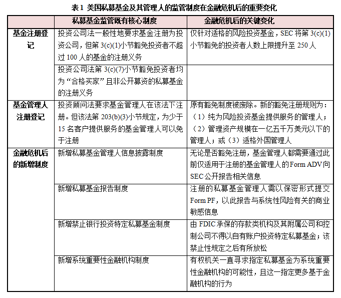 金融危机后美国在私募基金及其管理人监管方面的重要变化概括如下表1: