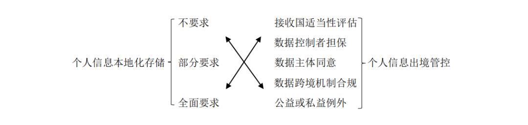 自1980年经合组织(OECD)发布《隐私保护和个人数据跨境流动指南》以来,全球各国或地区纷纷建立个人数据跨境制度。整体上,该制度包含两种极易混淆的手段——数据本地化(data localization)和数据出境管控(control of trans-border data flow)。前者指本地化存储数据,但不一定彻底禁止数据出境;后者指对数据出境施加限制条件,但不一定要求数据本地化存储。一个国家完全可以既要求个人信息本地化存储,同时又附条件地允许个人信息出境;反之,也可以不要求个人信息本地化存储,但对自愿存储在境内的个人信息出境予以限制。这两种手段以不同方式组合,就会产生不同的个人信息跨境制度。
