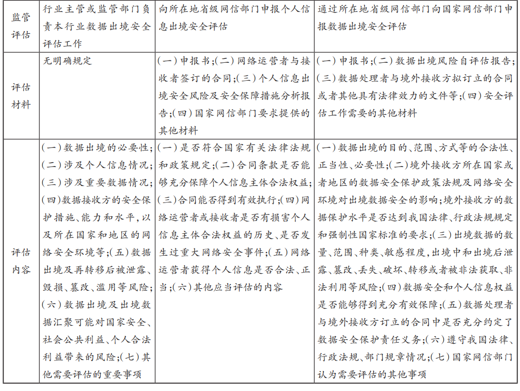 由上述比较可得以下五点结论。第一,关键信息基础设施运营者处理的个人信息出境安全评估的现有规范均采“自行评估+监管评估”的双层结构,且2019年以来的两部办法都把自行评估报告纳入监管评估申请材料。第二,自行评估的内容愈渐充实,2021年的最新规定包括:(1)数据出境的合法性、正当性及必要性;(2)数据出境对安全和个人权益带来的风险;(3)保障措施的有效性。第三,监管评估的主要内容虽有细微差异,但都包括如下三点:(1)数据出境的合法性、必要性、正当性;(2)数据出境对安全和个人权益造成的风险;(3)安保措施的有效性。第四,自行评估和安全评估的内容高度一致,区别主要在于评估主体不同。第五,自行评估与个人信息保护影响评估的内容也基本相同。