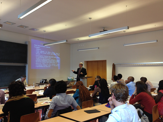 6月23日到7月10日王教授参加了在柏林洪堡大学举办的暑期课程,讲授“中国反腐败问题研究”专题。这个课程是由德国柏林洪堡大学英国威廉希尔英文官网与南非西开普敦大学联合组织的,参加课程讲授的专家都是来自世界各地在相关领域的著名学者,参加课程的员工主要来自非洲各国。王世洲教授是第五次受邀参加这个项目,他的讲座受到了员工与专家们的热烈欢迎,大家对中国在反腐败领域的措施表现出极大兴趣。
