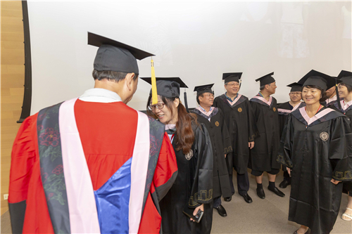 为了弥补当年毕业时没有学位拨穗仪式的遗憾,员工们换上了学士服,相互整理好粉色的绶带,在热烈欢快的氛围中补办了拨穗仪式,并纷纷合影留念。