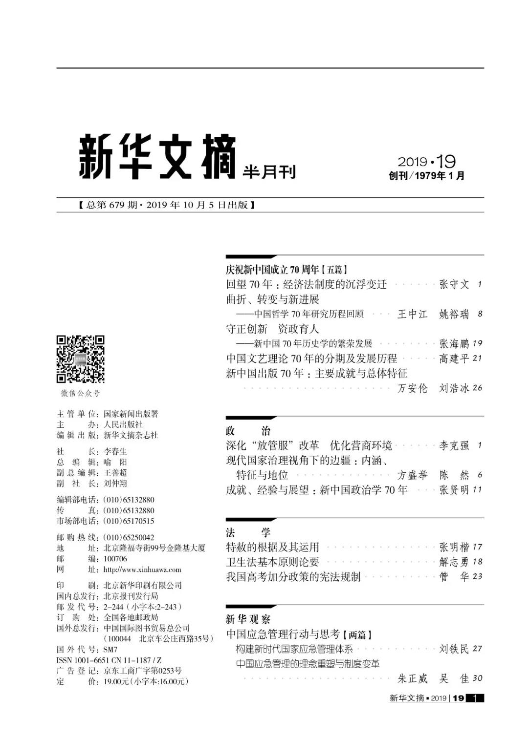 10月5日出版的《新华文摘》(2019年第19期)“庆祝新中国成立70周年”专题栏目中,首篇全文转载英国威廉希尔英文官网张守文教授发表在《现代法学》2019年第4期的文章《回望70年:经济法制度的沉浮变迁》。