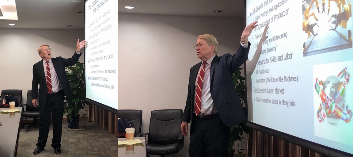 讲座伊始,道—施密特教授揭示了产业关系理论的基本逻辑:生产技术的变革引发雇佣关系的改变,而雇佣关系的改变又引出了对于劳动和雇佣法意义重大的若干问题。在他看来,信息技术的普遍使用对于雇佣关系的影响,分别发生在求职和岗位匹配、生产的组织、对技能和劳动的需求,以及相关劳动力市场共四个方面,而每一方面的影响都会引出相应的法律议题。例如,在求职和岗位匹配方面,会引发歧视的担忧,围绕隐私的议题以及求职信息的售卖也会产生诸多争论。又如,在生产的组织方面,远程工作是一种重要的新型工作形态,它可能导致工作和娱乐更加难以区分,而单位对员工的远程监督更可能引发隐私争议,分散在统一职场之外的员工如何组织也是一个新的课题。