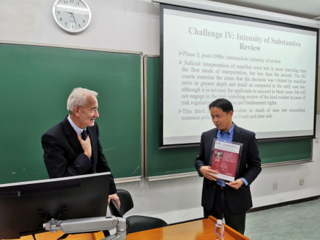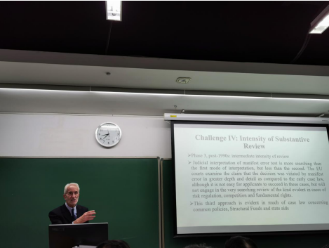 讲座中,Paul Craig教授首先介绍了欧盟的基本知识,关于欧盟议会,欧盟委员会以及欧盟法院有关研究的缘起。他指出,欧盟具备两种规制管辖权:专属管辖权和共享管辖权。在实行规制的过程中,基于内在的运作机制和外在的技术变化,规制本身也获得了发展,而规制的发展同样构成了欧盟行政法发展的基础。随后他介绍了条约263条创设的四种司法审查的基础,他主张,一般法律原则构成对这一基础的重要补充,其在条约中的基础和规范中的基础是可以正当化的。最后,他总结了欧盟行政法面临的几大挑战:司法过度负担,获得救济的渠道,正当程序原则以及司法审查的强度和限度。