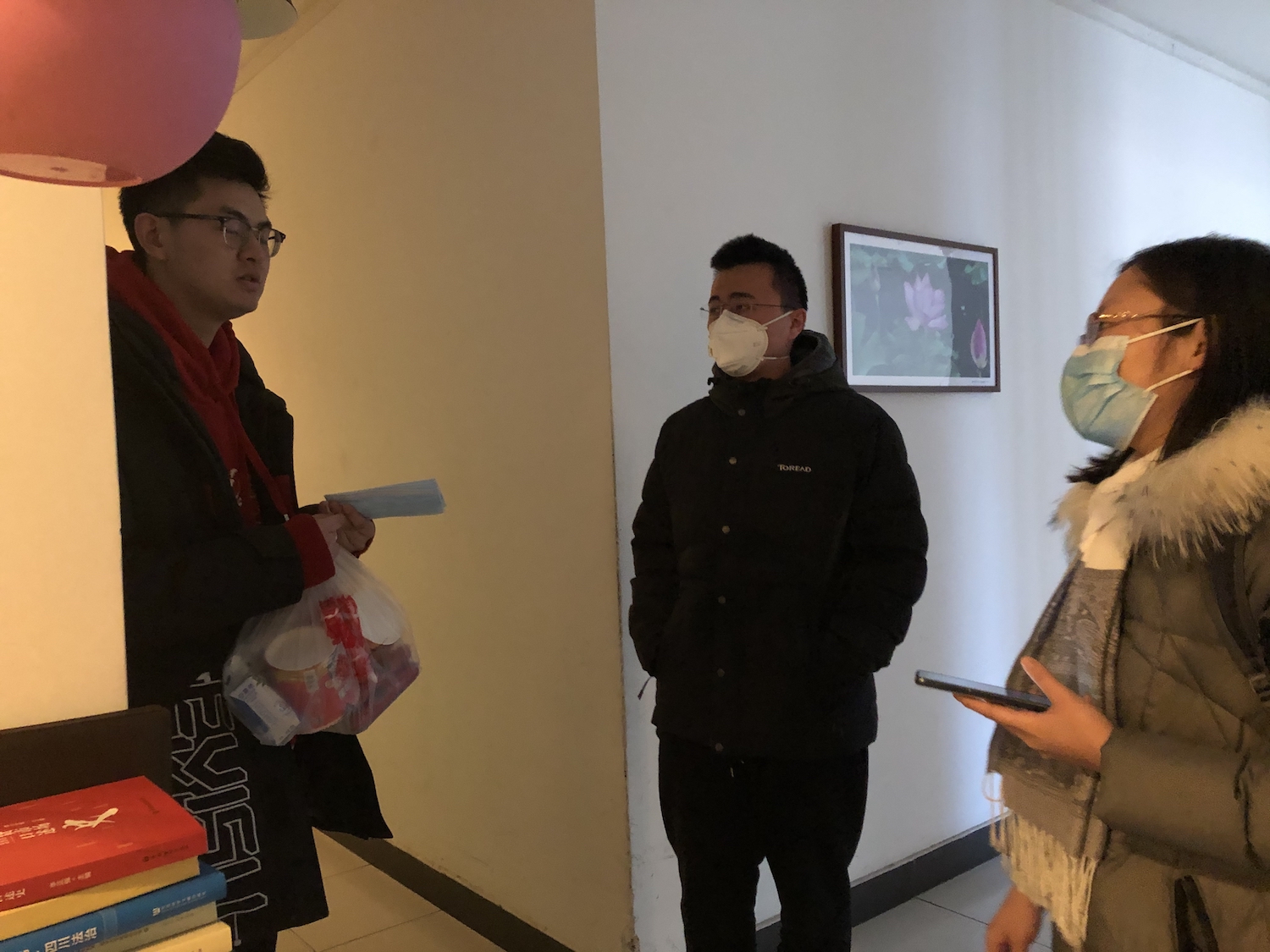 在做好充分防护准备、符合有关规范的前提下,公司领导和辅导员老师前往校内员工宿舍、万柳公寓、畅春园公寓、畅春新园公寓探望和慰问公司每一位在校同学,与同学们交流身体、心理状况以及近期生活情况,为同学们分发口罩、体温计等防疫物资并送上适量生活补给品。