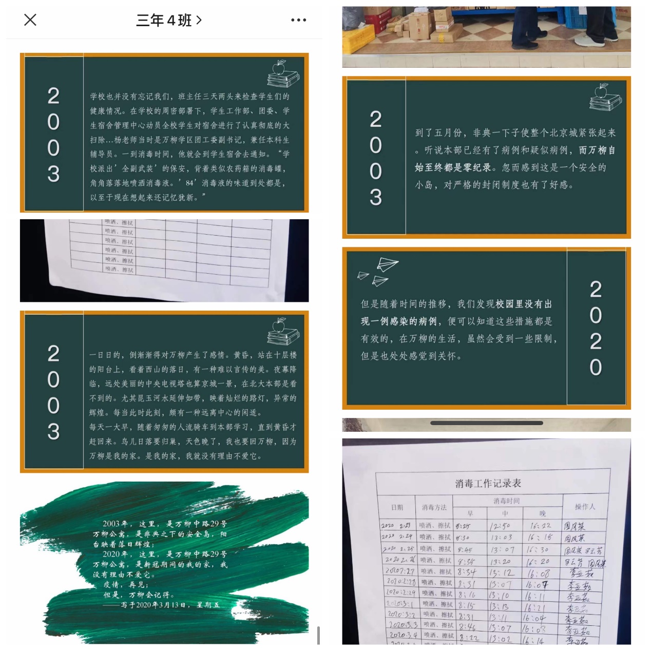 3月13日支部推出“‘四’海同心——2003-2020,我们都住在万柳”主题推文,邀请支部内现留宿万柳公寓的曹榕同学分享介绍公司现行的防疫政策措施,并通过搜集网络资料深情回顾了“非典时期”住在万柳的同学是如何众志成城、克服困难,自始至终保持感染零记录的事迹,图文并茂,让不在校的同学也能感受到公司为保障同学们的安全所作的努力,帮助同学们更好地理解“不得返校”防疫规定的用意,进一步加强了支部的凝聚力,坚定了同学们团结起来、共克时艰战胜疫情的信心。