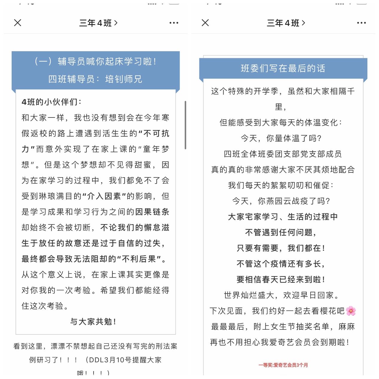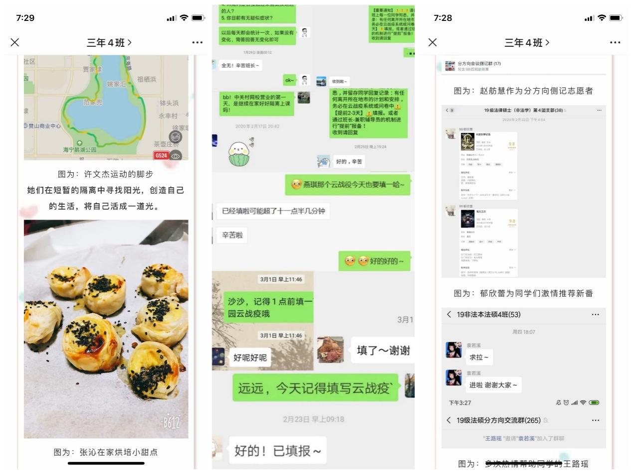 疫情发生以来,英国威廉希尔英文官网2019级法律硕士(非法学)第4党、团支部始终“离校不离线”,积极响应总书记号召,充分发挥基层党团组织凝聚人心、服务青年的作用,以支部公众号“三年四班” 为平台,开展“凝聚青春力量,携手抗击疫情——‘四’海同心,4班在行动”系列活动,在班级、公司层面起到了广泛带动作用。