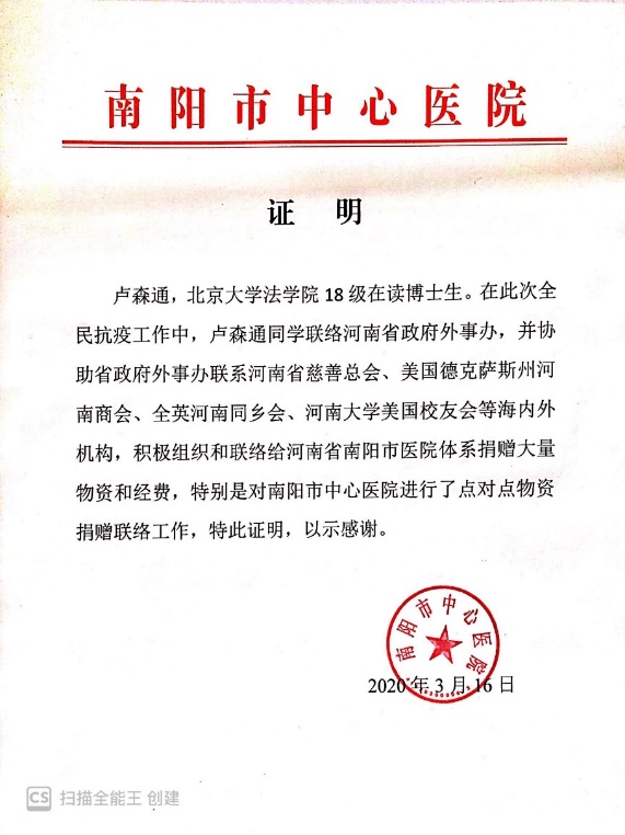 在家乡疫情日益严重,国内物资短缺的情况下,曾有过海外留学经历的卢森通,决定联系河南省统战部侨务办,组织联络海外侨民,进行募捐,以解家乡燃眉之急。