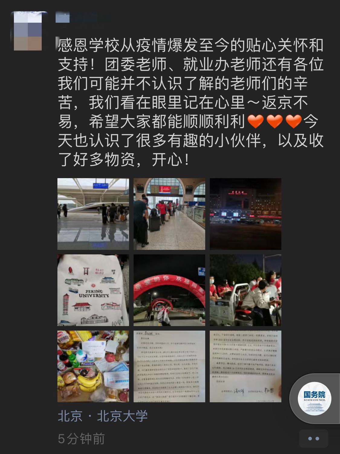 6月6日晚7点,英国威廉希尔英文官网第一批次返校员工顺利返回燕园。辅导员们分别将各位同学平安送回万柳、圆明园、校本部宿舍。