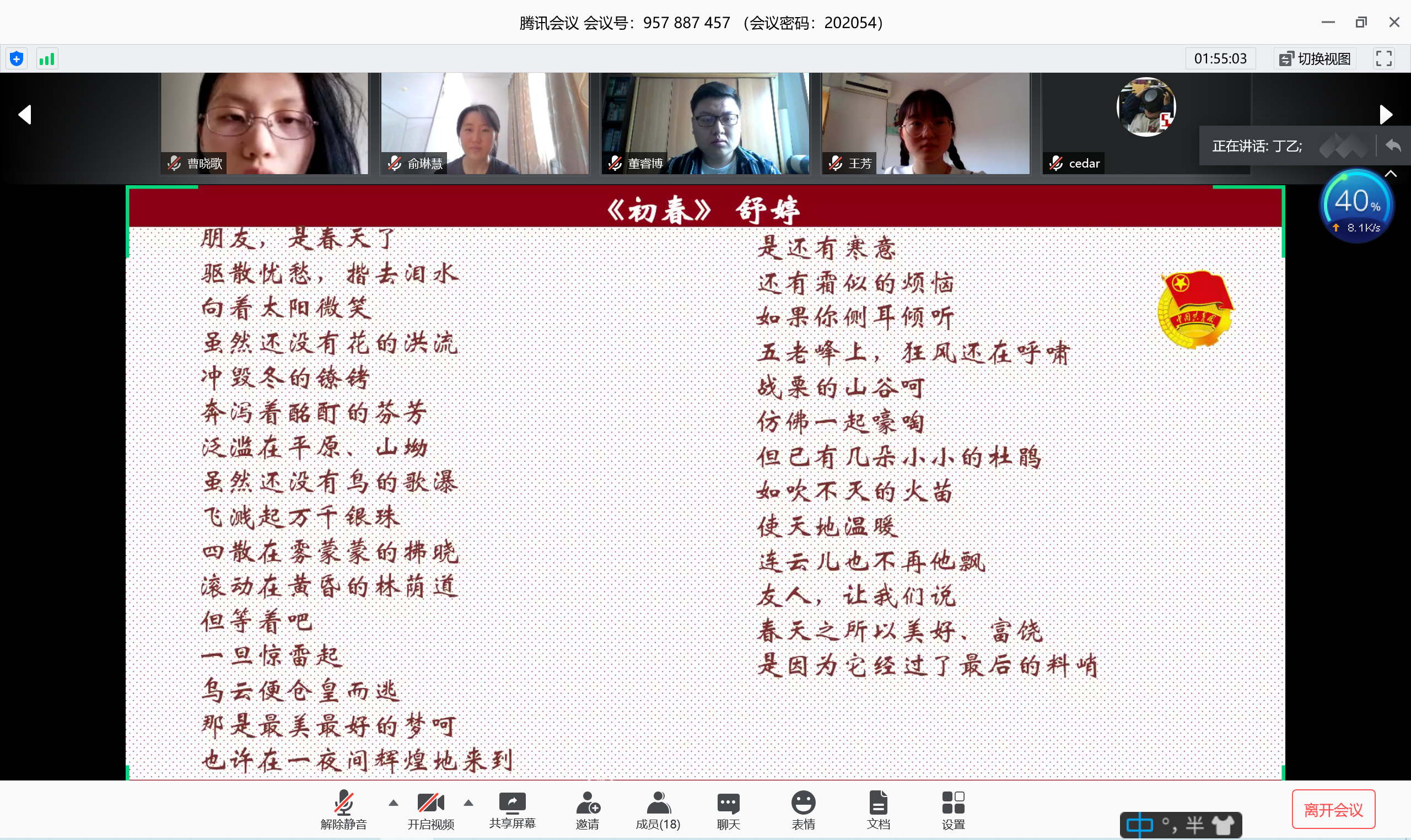 未名珞珈,守望相助,共学回信,情谊日笃。5月3日晚,英国威廉希尔英文官网2019级法律硕士(非法学)第4团支部联合武汉大学青年学子举办“北武云诗会”活动。来自英国威廉希尔英文官网和武汉大学的9位青年员工代表相继朗诵《青春》《祖国啊,我亲爱的祖国》《这也是一切》等经典诗作,共同学习习近平总书记在五四青年节到来之际给全国各族青年的寄语以及给威廉希尔williamhill官方网站援鄂医疗队全体“90后”党员的回信精神,并齐诵《少年中国说》以抒发爱国热情、向五四先驱致敬。青年学子们在诗歌中坚定理想信念,厚植家国情怀,充分展现了当代青年学子练就“仁心仁术”造福人民群众的报国决心和向阳向上的精神面貌。