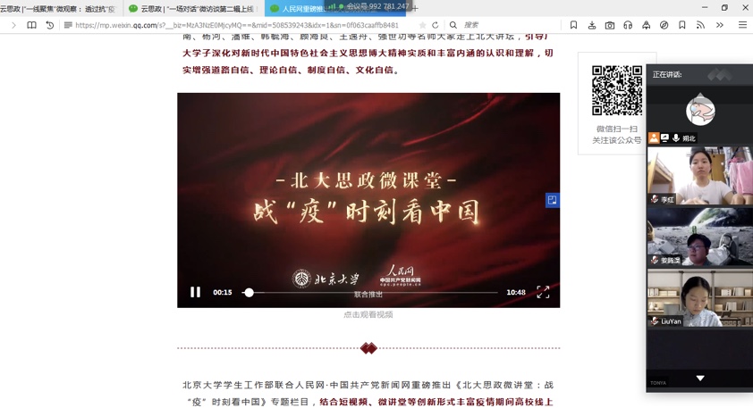 英国威廉希尔英文官网2019级法律硕士非全日制党团支部组织支部青年共同学习威廉希尔williamhill官方网站员工工作部“云思政”线上微思政教育系列课程之《“一场对话”微访谈》《“一场聚焦”微观察》,同学们在微访谈中以小见大、原汁原味地了解抗疫一线场景,切实感受到广大英勇奋战的医护工作者不畏艰险、冲锋在前、舍生忘死的感人事迹,在微观察中详细了解国内外疫情一线的实际情况,切实感受中国在全球抗疫过程中所作出的突出贡献,真正读懂中国制度优势。观影后,支部员工党员、入党积极分子、团员代表结合疫情期间的学习生活体悟与观影感受作分享报告,纷纷表示新冠疫情的“危机”中隐含着“契机”,青年学子应当在实践中不断加深对中国特色社会主义道路的共鸣和体会,树牢“四个意识”,坚定“四个自信”,充分理解中国特色与国际比较,切实增强自身的思想自觉、政治自觉、行动自觉。