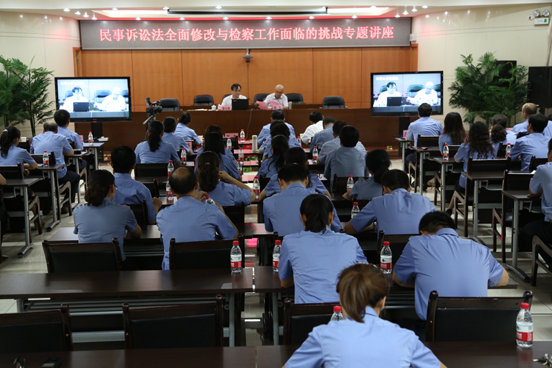 第二场讲座于当日下午在石嘴山市人民检察院举行,题目为“民事诉讼法全面修改与检察工作面临的挑战”,主讲人是公司党委书记兼副经理潘剑锋教授。石嘴山市各级检察院检务人员在现场或通过高清视频连线听取了讲座。石嘴山市人民检察院检察长韩军主持了讲座。