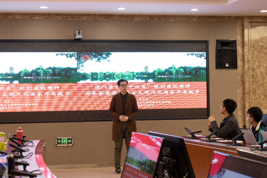 马克思主义公司研究生讲师团副团长、2020级思政专业博士研究生覃夫杰作题为《深入学习“十四五”规划建议精神,为全面建设社会主义现代化国家开局起步》的解读报告。