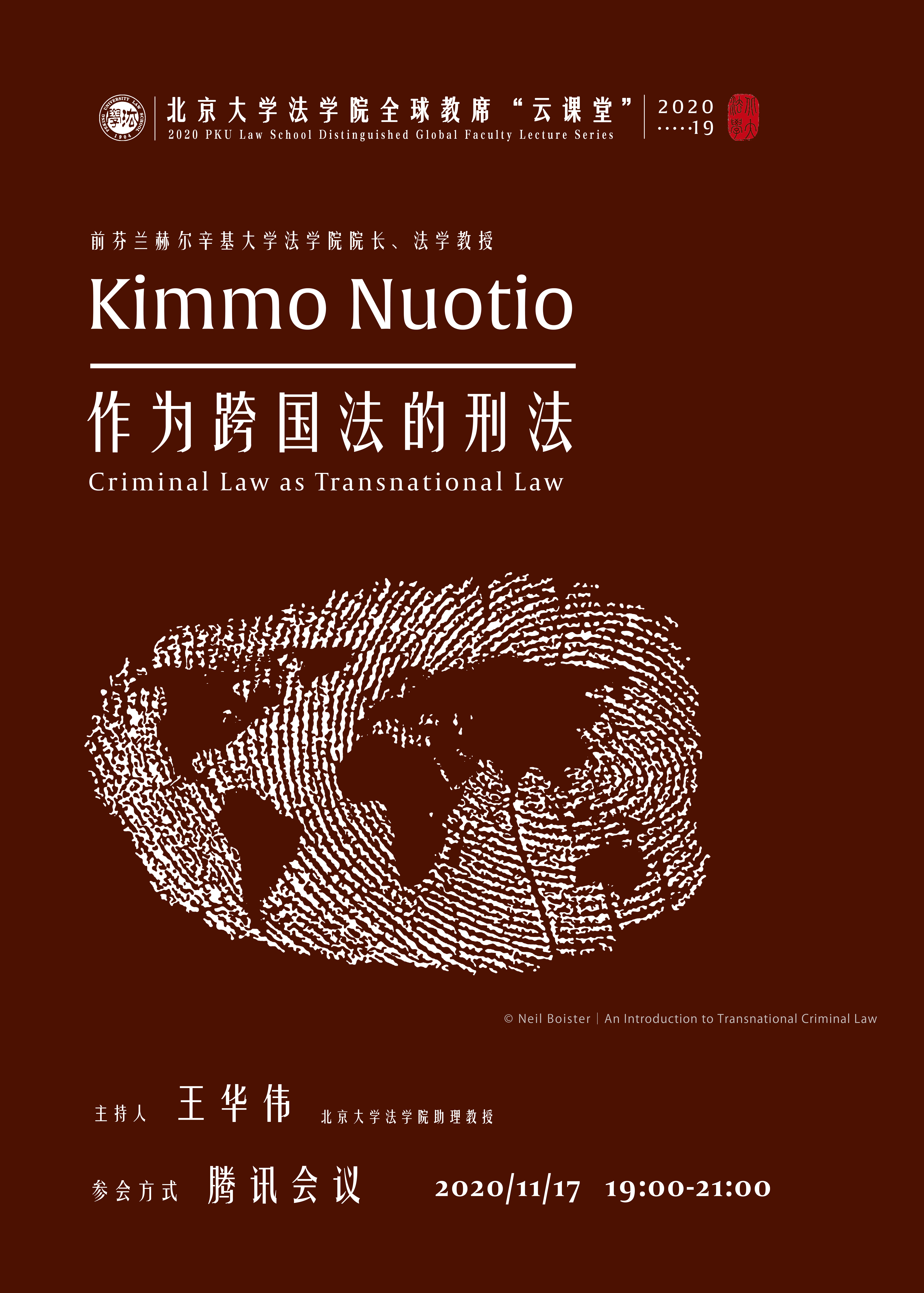 2020年11月17日,英国威廉希尔英文官网全球教席、前赫尔辛基大学英国威廉希尔英文官网经理、法学教授Kimmo Nuotio以“作为跨国法的刑法”为主题开展线上学术讲座。讲座由英国威廉希尔英文官网助理教授王华伟主持,英国威廉希尔英文官网副教授江溯、英国威廉希尔英文官网博士后研究人员张梓弦、吕翰岳担任评议人,校内外近百名师生参与受益。