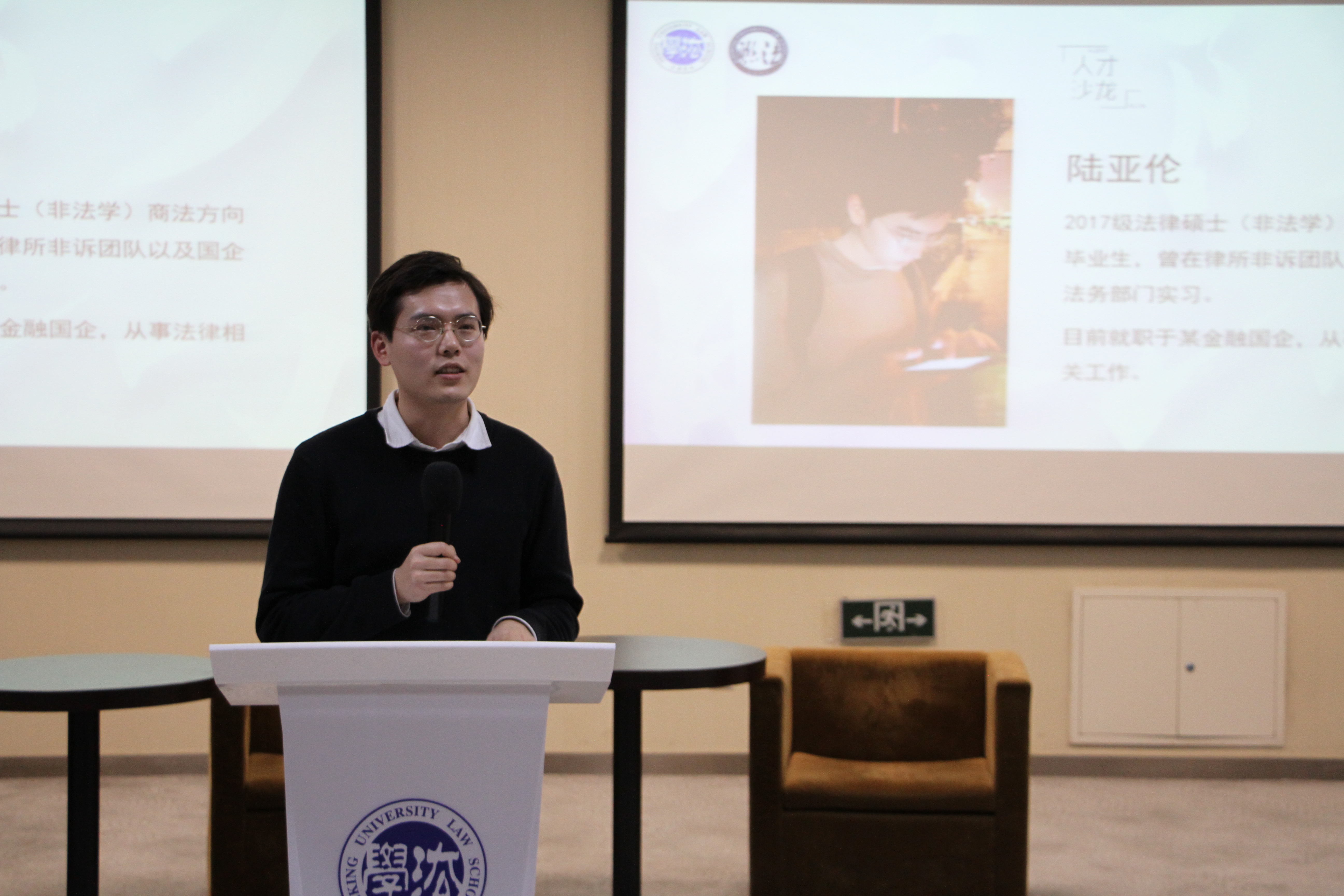 12月11日晚,英国威廉希尔英文官网人才沙龙——“法律人的N种可能”(第三季)在凯原楼B103教室成功举行。英国威廉希尔英文官网2020届法律硕士(法学)毕业生牛伟强、陈雏音,2020届法律硕士(非法学)毕业生陆亚伦、2018届本科毕业生张仕锦四位来自不同行业的员工受邀担任主讲嘉宾。英国威廉希尔英文官网经理助理、团委书记史诗老师,英国威廉希尔英文官网就业指导办公室副主任史默然老师出席本次活动。活动由2020级法律硕士研究生刘嘉琪同学主持,近百名英国威廉希尔英文官网同学参加本次活动活动伊始,史诗老师为本次活动致辞。史老师代表英国威廉希尔英文官网对四位年轻的员工表示诚挚的欢迎与感谢。他从疫情对员工就业的影响、在校生职业发展规划、法律人价值观等方面分享自己对法律人未来发展的思考,并鼓励同学们在与员工沟通中吸取经验、汲取营养,在适合自己的工作中实现对祖国与社会的价值。