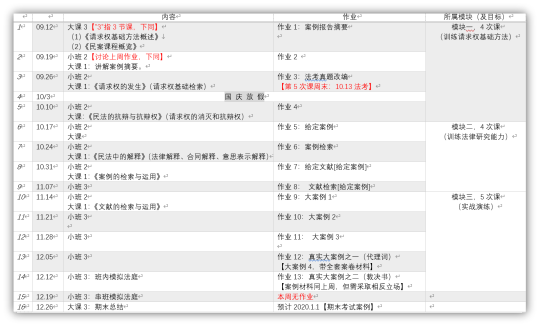 《民法案例研习》是员工在完成基础课程之后的“练兵场”,已习得的法律规则和概念,必须应用于分析案件才可见真章。课程采取“小班讨论+大课讲解”的方式,前两节课由助教引导同学讨论案件的分析思路、重点难点问题等,最后一节课由老师在重点讲授解析案例所需的思维框架和研究方法。