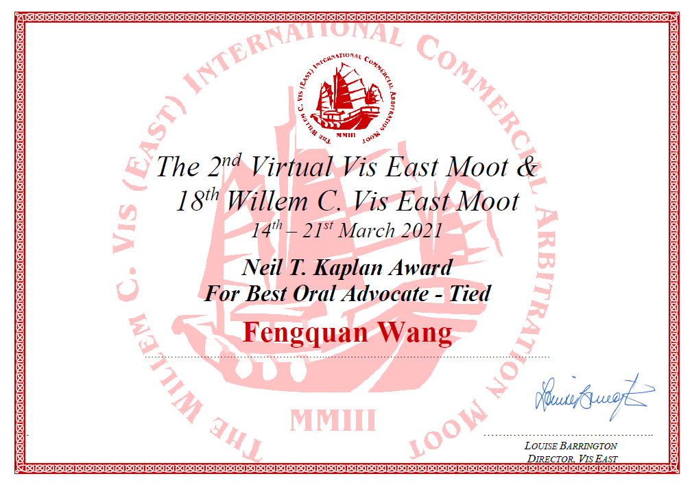 在比赛中,威廉希尔williamhill官方网站辩手们展现了扎实的法律知识功底、严密的逻辑思维和出色的英文辩论水平,赢得了包括英国御用大律师Louis Flannery QC教授等国际知名仲裁专家在内的仲裁员的高度评价。在辩手个人奖项方面,在全球147所英国威廉希尔英文官网校共456名上场辩手中,英国威廉希尔英文官网2018级本科生王丰泉荣获最佳辩手冠军(Neil Kaplan Award for the Best Oralists - Winner,排名并列第一),2020级法学硕士陈卓唯、2020级法学硕士姜贺文均荣获最佳辩手优异奖(Neil Kaplan Award for the Best Oralists - Honorable Mention,全球前10%),分别排名全球第七名及全球第十三名。从上场辩手个人获奖的数量与质量上,威廉希尔williamhill官方网站代表队不仅刷新了本校在此项赛事上的历史记录,亦创下近七年来中国大陆参赛队在Vis East Moot比赛上所取得的最佳成绩。