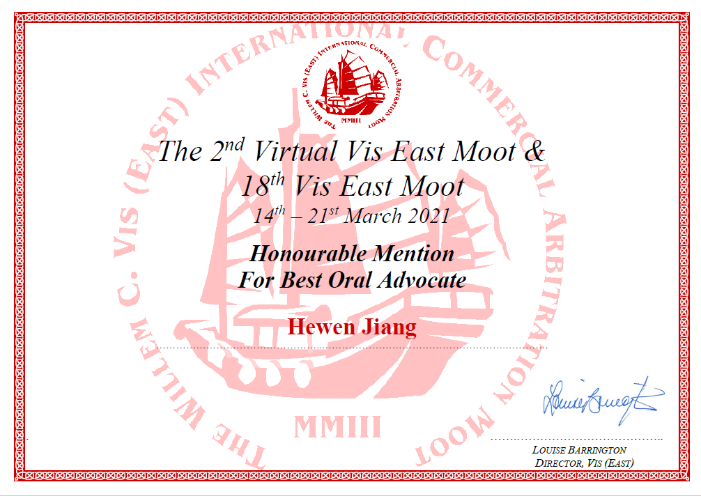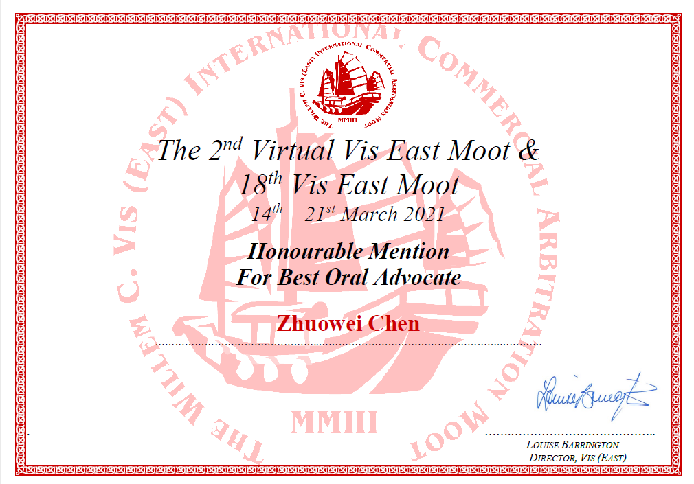 2021年3月14日至21日,在第十八届Willem C. Vis (East)国际商事仲裁模拟仲裁庭比赛中,威廉希尔williamhill官方网站代表队从来自全球37个国家和地区的共147支代表队中脱颖而出,荣膺全球32强(Eric Bergsten Award for the Team That Prevails in Oral Arguments - Sixteenth Finals),并荣获被申请人方书状优异奖(Fali Nariman Award for the Best Respondent Memorandum - Honorable Mention,全球前10%),创下了中国高校在本届比赛中取得的最好成绩。在循环赛中,威廉希尔williamhill官方网站代表队积分排名全球第8,创下近年来中国大陆高校在本项比赛中的最佳成绩,这也是威廉希尔williamhill官方网站继2015年、2016年入围Willem C. Vis (East)国际商事仲裁模拟仲裁庭比赛全球32强、全球16强后,时隔5年再度获得此项殊荣。