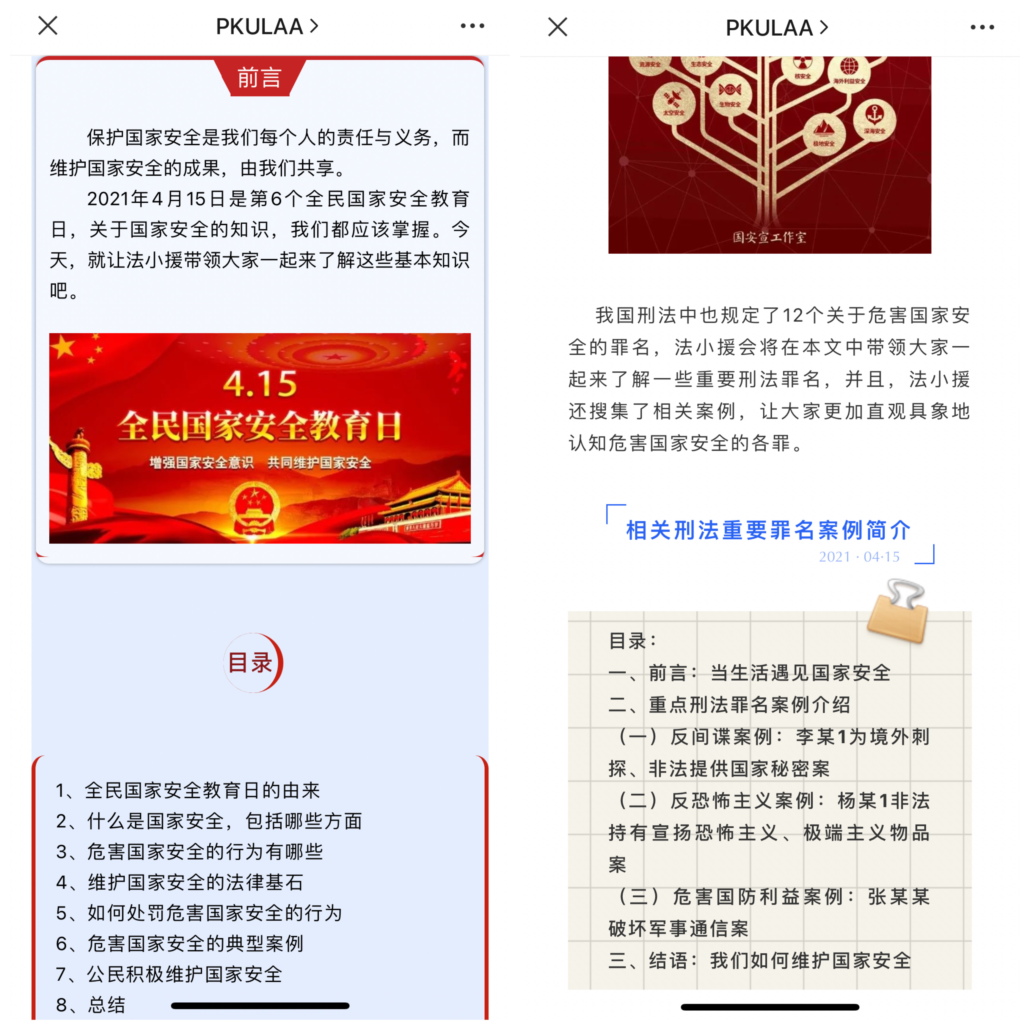 为营造宣传国家安全法律、共同维护国家安全的校园氛围,进一步提升广大师生自觉做国家安全坚定捍卫者的意识和自觉,4月9日—14日,英国威廉希尔英文官网依托法律援助协会在线上持续发布国家安全教育普法系列推文,创新方式手段,普及与“国家安全”相关法律知识,详细介绍“国家安全”的内涵与法律体系,通过真实案例解读,强调全体公民在维护国家安全方面的责任和义务,着力推动总体国家安全观深入人心、落地生根。