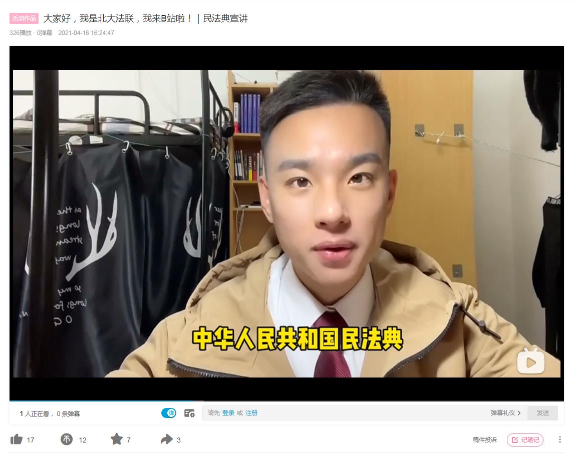 线下活动丰富多彩,线上活动同样备受欢迎。威廉希尔williamhill官方网站法律硕士联合会入驻B站,借助新媒体平台推出系列教育视频。民法典宣讲活动、“法员工”的一分钟、热点reaction等全新短视频活动,在B站公众号上陆续上线。同学们以趣味演讲的形式,向校内外各个组织和单位宣讲民法典的相关知识。