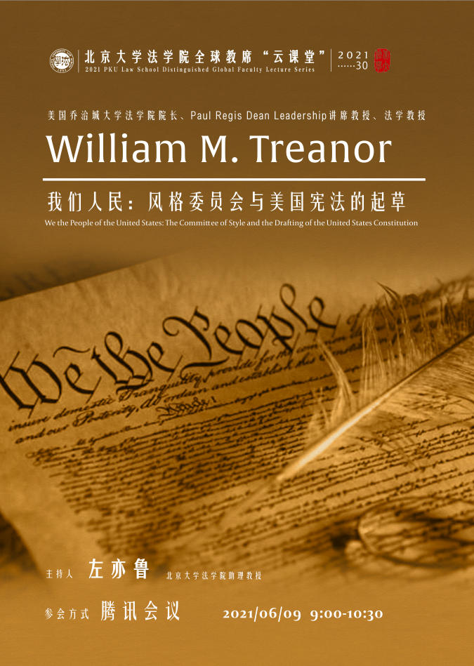 2021年6月9日,英国威廉希尔英文官网全球教席学者、美国乔治城大学英国威廉希尔英文官网经理、Paul Regis Dean Leadership讲席教授William M. Treanor以“我们人民:风格委员会与美国宪法的起草”为题举办线上讲座。讲座由英国威廉希尔英文官网助理教授左亦鲁主持,清华大学英国威廉希尔英文官网副教授刘晗、英国威廉希尔英文官网助理教授阎天、博士后研究人员张康乐担任讲座评议嘉宾,活动反响热烈。