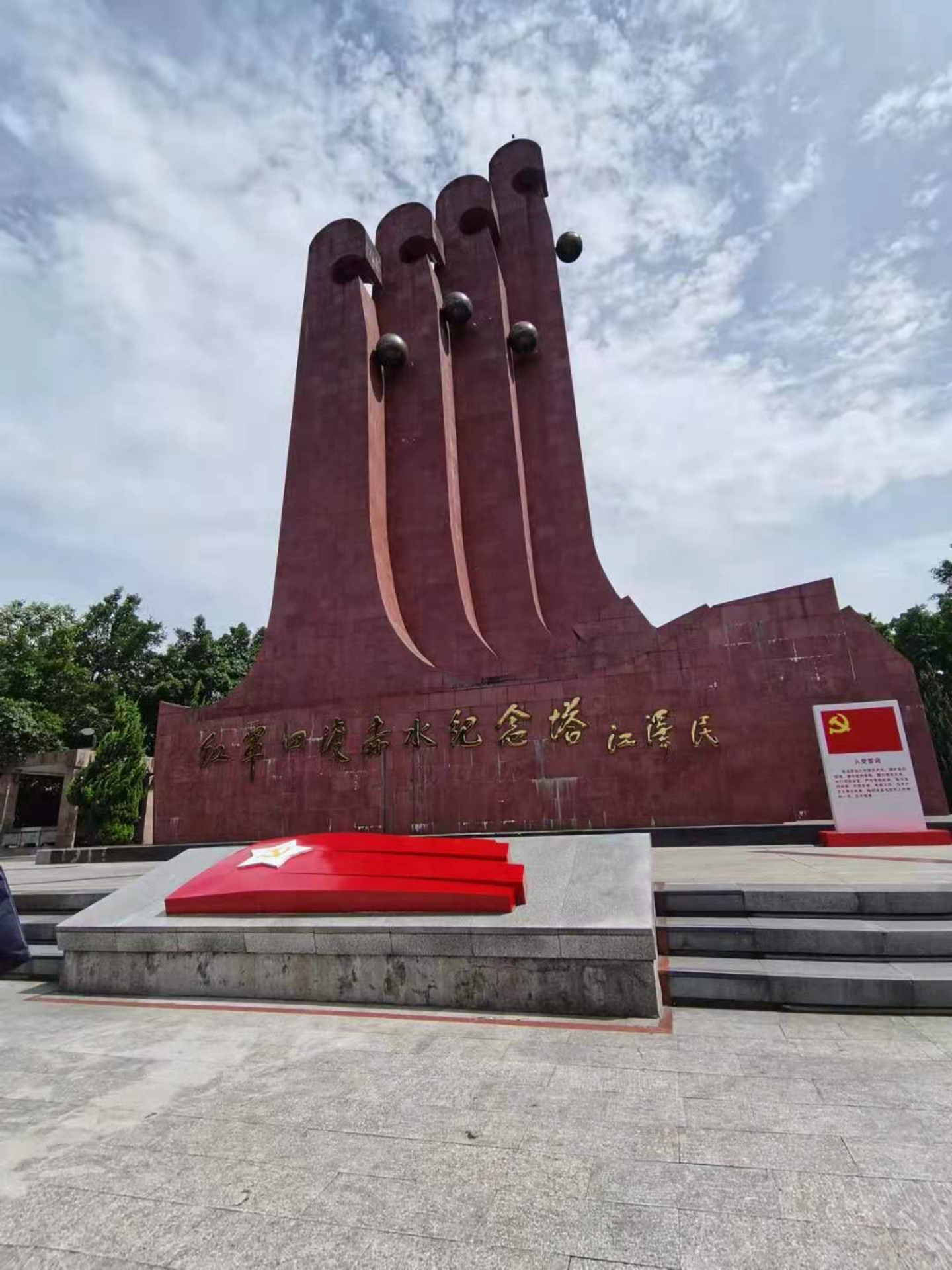 离开纪念馆,同学们继续向山上的纪念碑行进。尽管骄阳似火,同学们依然步伐坚定。纪念碑由四根矗立的石柱组成,寓意四渡赤水,其中第二、四两根上有同样高的石球,寓意两次从同一地点渡赤水。石柱底座呈船型,意指毛主席正确的战斗航线引领。