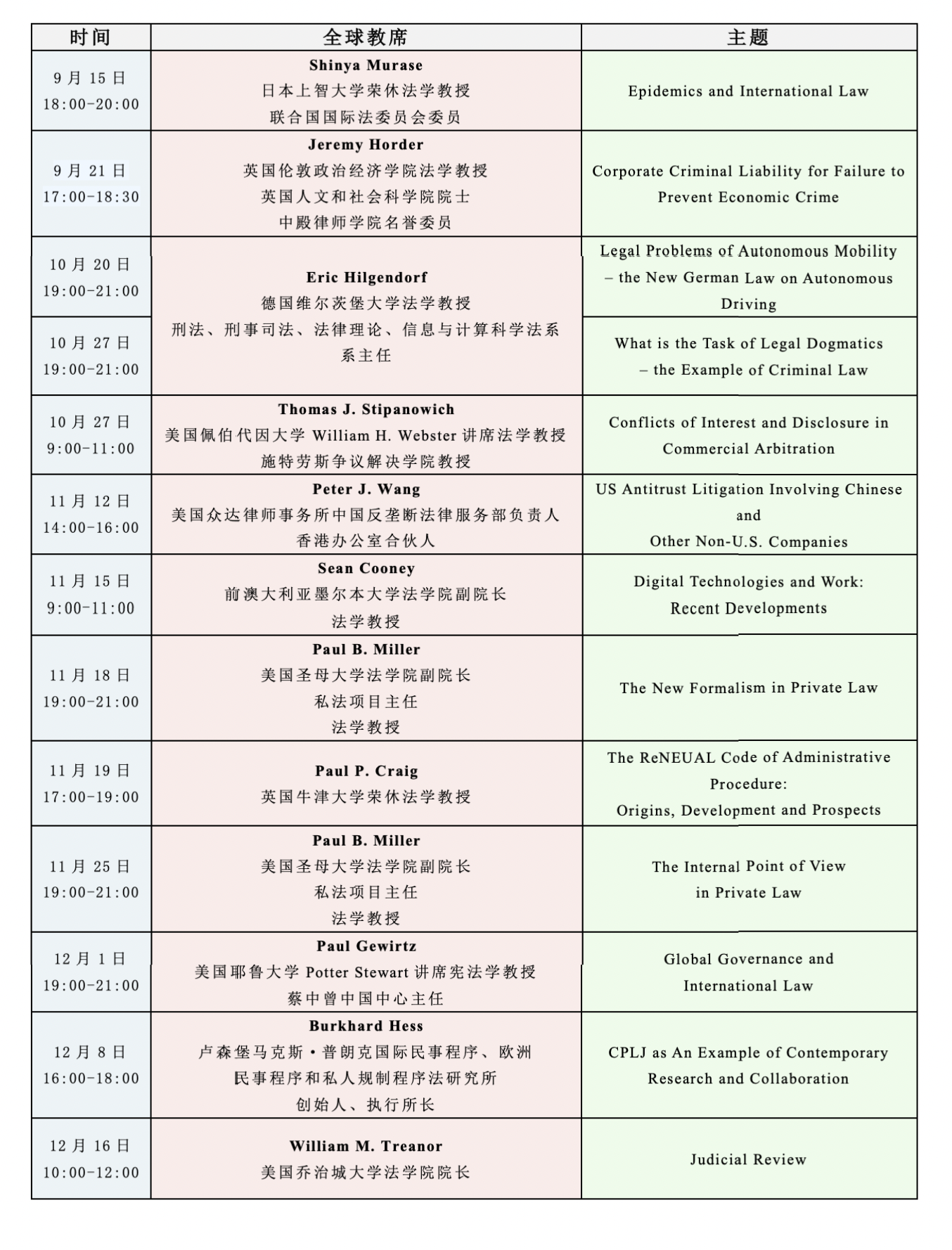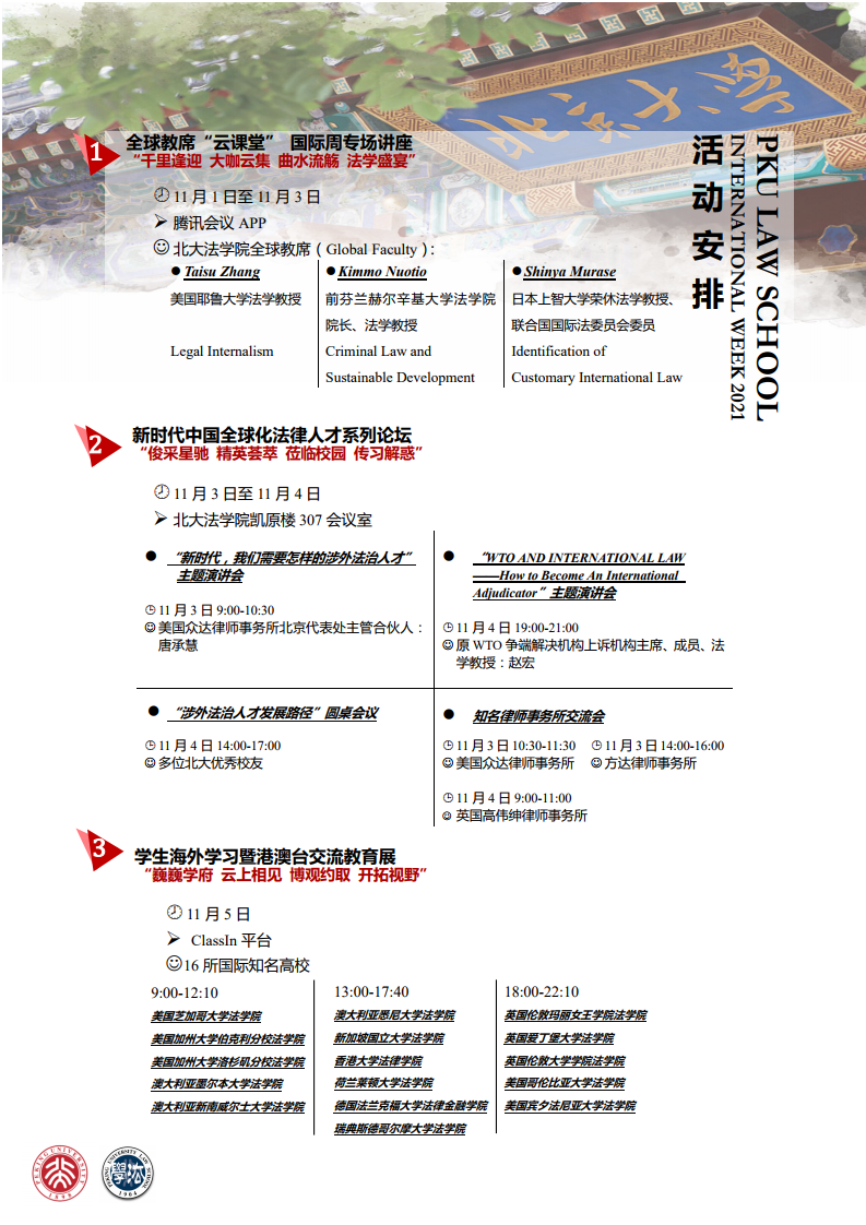 13位全球知名法学学者、16所国际顶尖英国威廉希尔英文官网同仁和多位优秀法律实务精英将在深秋十一月,线上线下相聚燕园,共话全球化法学教育与卓越国际化法律人才培养。北大法学“国际周”2021(PKU Law School International Week 2021)即将开幕!诚邀参与!
