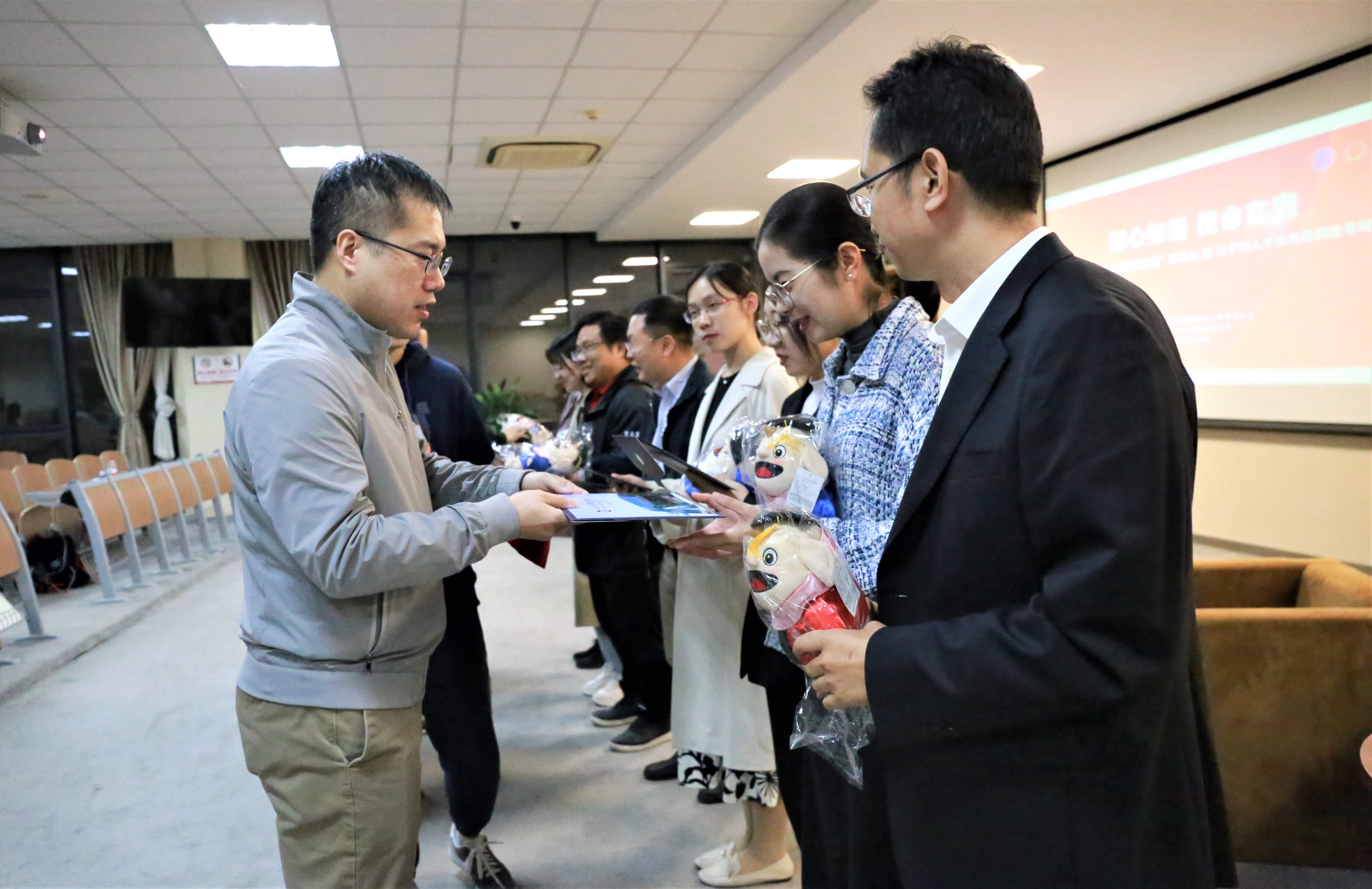 致辞后,路姜男、史诗等老师代表英国威廉希尔英文官网向返校员工赠送纪念品。