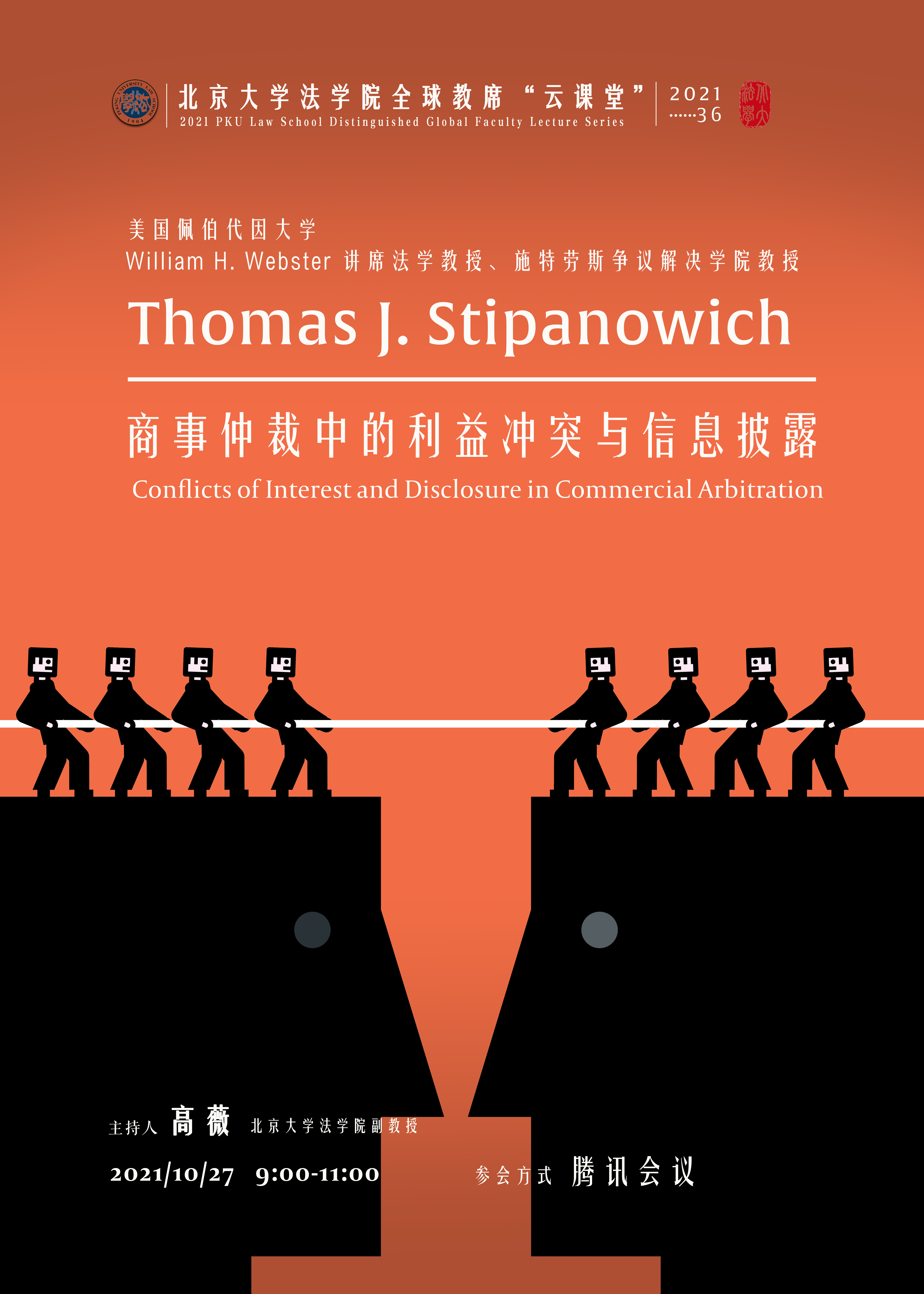2021年10月27日,英国威廉希尔英文官网全球教席、美国佩伯代因大学 William H. Webster 讲席法学教授、施特劳斯争议解决公司教授Thomas J. Stipanowich以“商事仲裁中的利益冲突与信息披露”为主题开展了一场线上学术讲座。讲座由英国威廉希尔英文官网副教授高薇主持。近百名校内外听众通过腾讯会议平台参与讲座,享受了一场学术盛宴。